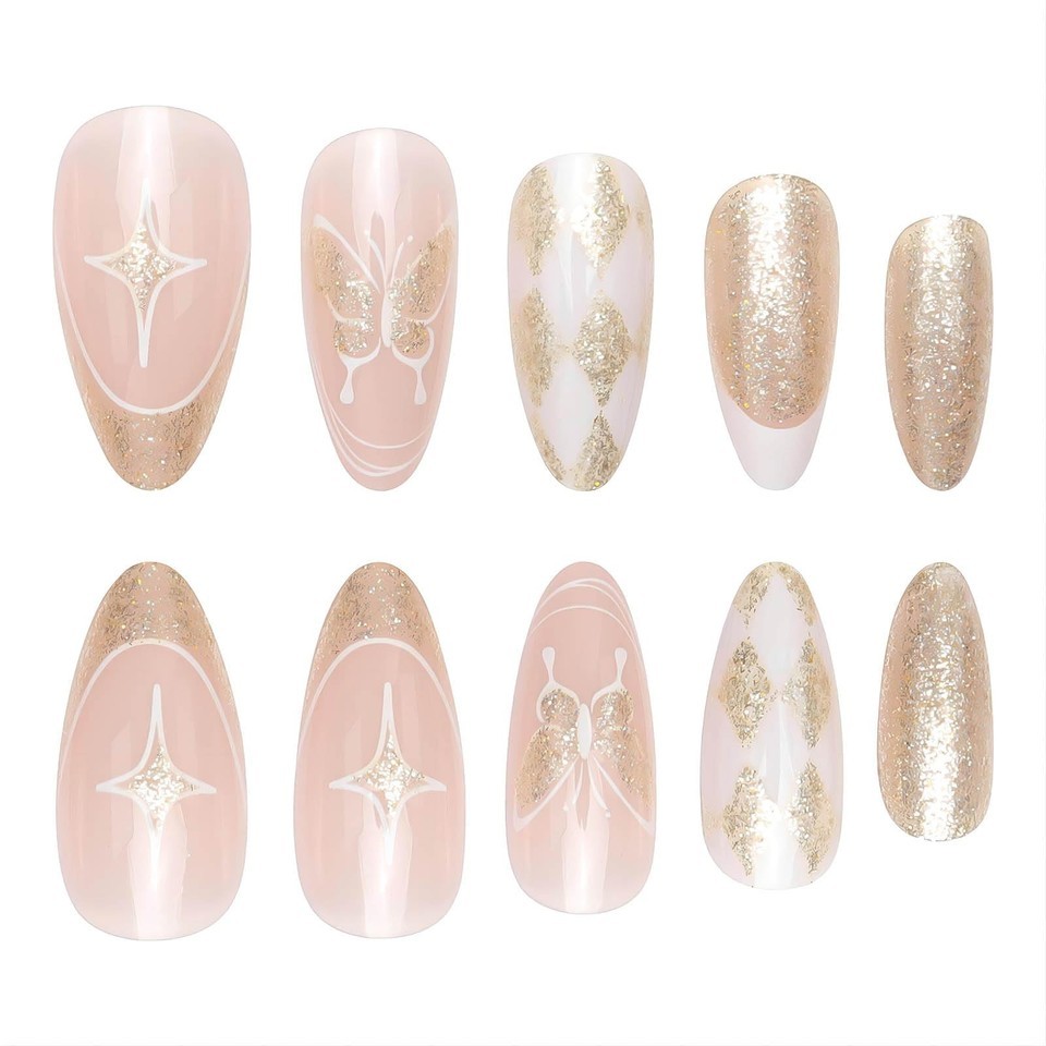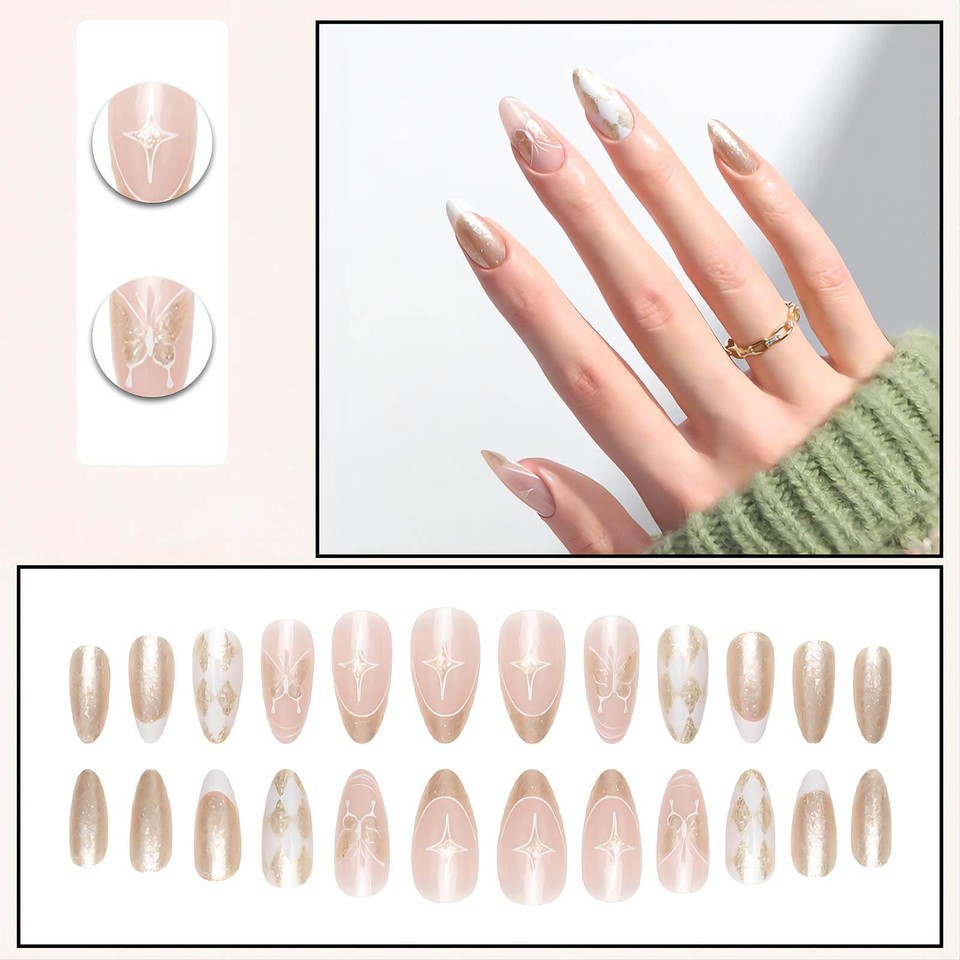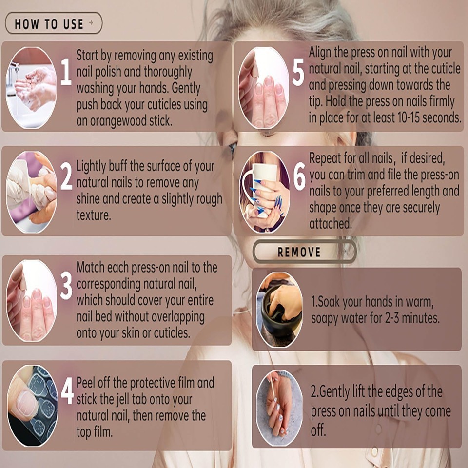 Product Description Feature 1. There are a total of 24 pcs fake nails, including 12 sizes, you can DIY your unique nail art. 2. Our nails are made of high-quality materials, will not harm your nails or body, using 100% safe and healthy materials. 3. In just 5 minutes, you can get the same shiny look yourself instead of spending half an hour paying for an expensive manicure at a nail salon. 4. Suitable for professional, nail art school/college, nail art artist and personal/home use, etc. 5. Suitable for nail salons and DIY nail art at home, wonderful gift for your wife, Girlfriend, Mother or sisters, And excellent for Parties/Wedding/Costume Ball. How to Use: 1. Gently sand the surface of your nails, rinse and dry. 2. Choose suitable false nails and apply jelly glue on the back of the false nails. 3. Press the fake nails on your nails and hold for 25 seconds. 4. Trim according to the nail shape and length you want. How to remove fake nails: 1. Soak your nails in warm water for 3-5 minutes. 2. Wait for the false nails to loosen, then gently remove the false nails and remove excess nail glue. 3.Fake nails can be reused after nail removal, you can keep the fake nail tip for next time use. Precautions: 1. Do not touching water within 1 hours after wearing 2.Please do not leave the nail in water for a long time, it will make the nail easy to fall off.