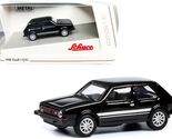 Brand new 1/87 (HO) scale diecast car model of Volkswagen Golf I GTI Black with Silver Stripes die cast model car by Schuco. Brand new box. Real rubber tires. Detailed interior, exterior. Officially licensed product. Does not have any openings. Made of diecast with some plastic parts. Dimensions approximately: L-1.75, W-0.75, H-0.625 inches.