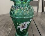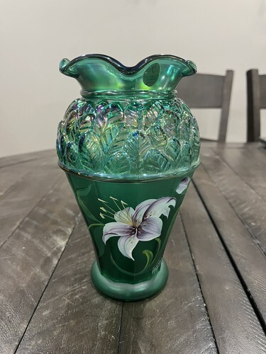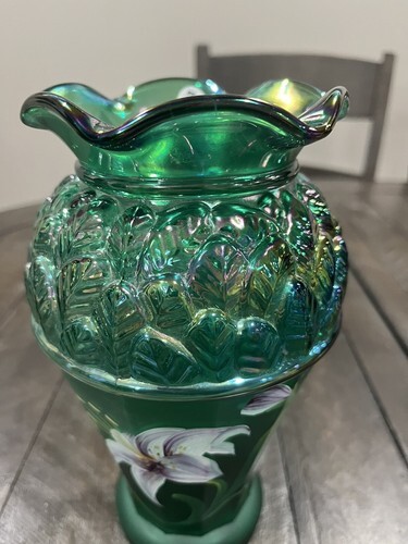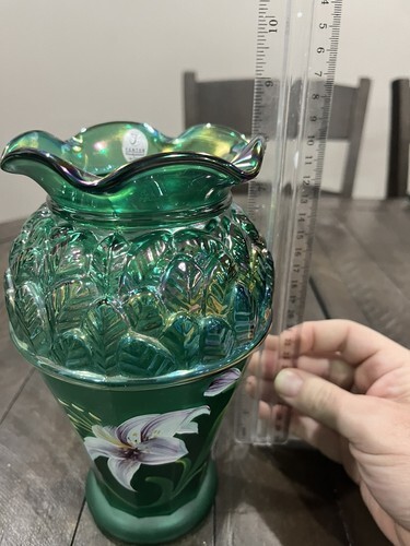- Vrg FENTON Designer Series Vase Emerald Green Iridescent Purple Lily Signed