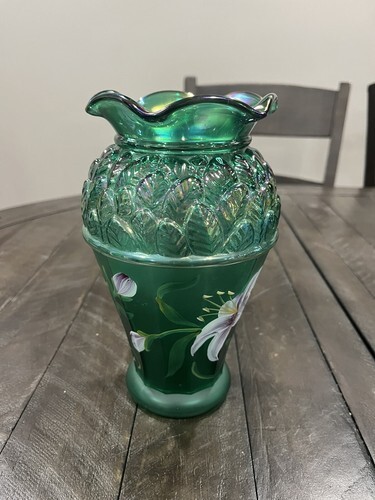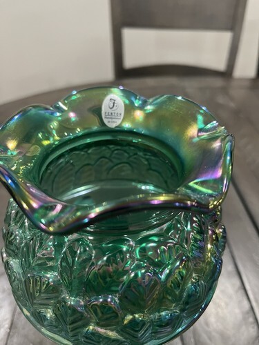 This beautiful vase from Fenton's Designer Series is a must-have for any glassware collector. The emerald green body is accented with iridescent purple lilies, making it a stunning piece of art. The vase is made of high-quality glass and crafted using studio techniques, ensuring its durability and uniqueness.