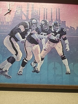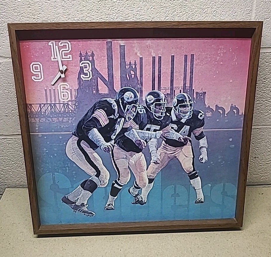 The product is an original NFL clock display featuring the Pittsburgh Steelers, a team in the National Football League. This clock measures 18 1/2" x 19 1/2" and would be a perfect addition to any football fan's sports memorabilia collection. With its retro design and iconic team logo, this clock is sure to be a cherished keepsake for any Steelers supporter.