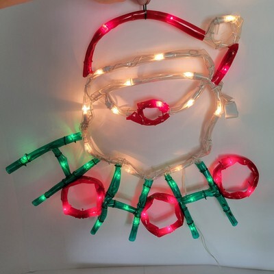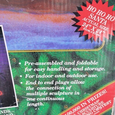 The Vintage Mr Christmas Ho Ho Ho Santa Light Sculpture is a 24" x 24" mini light sculpture made by Mr. Christmas in 1995. This foldable holiday decoration is perfect for Christmas celebrations and is powered by a corded source. With its nostalgic design and light sensor, this sculpture adds a festive touch to any holiday decor.