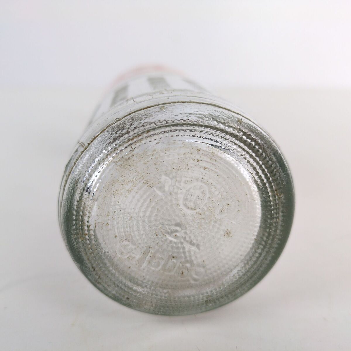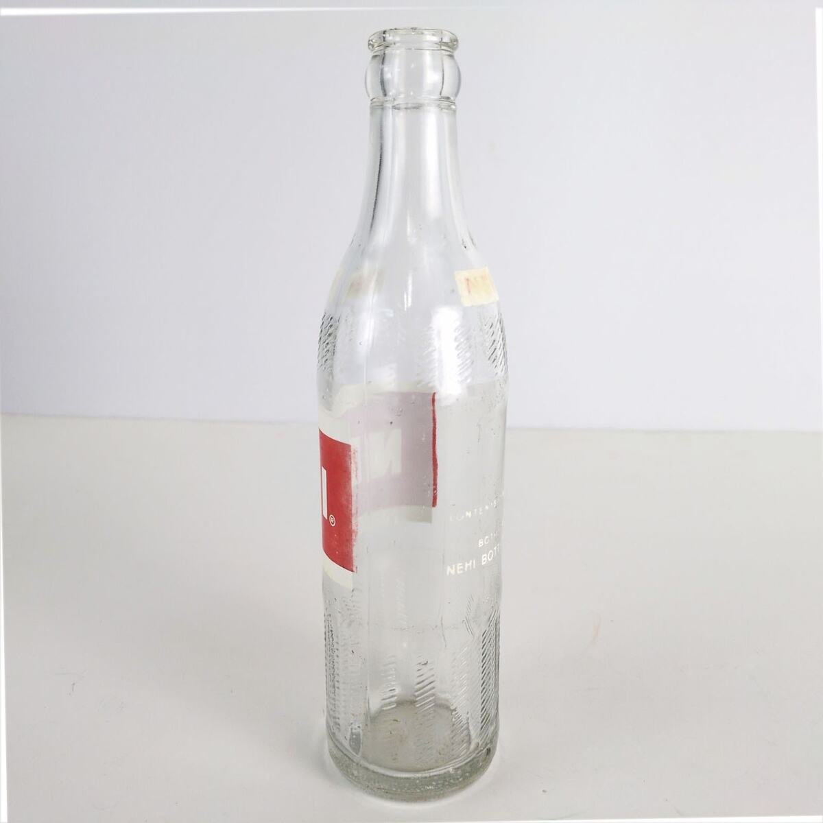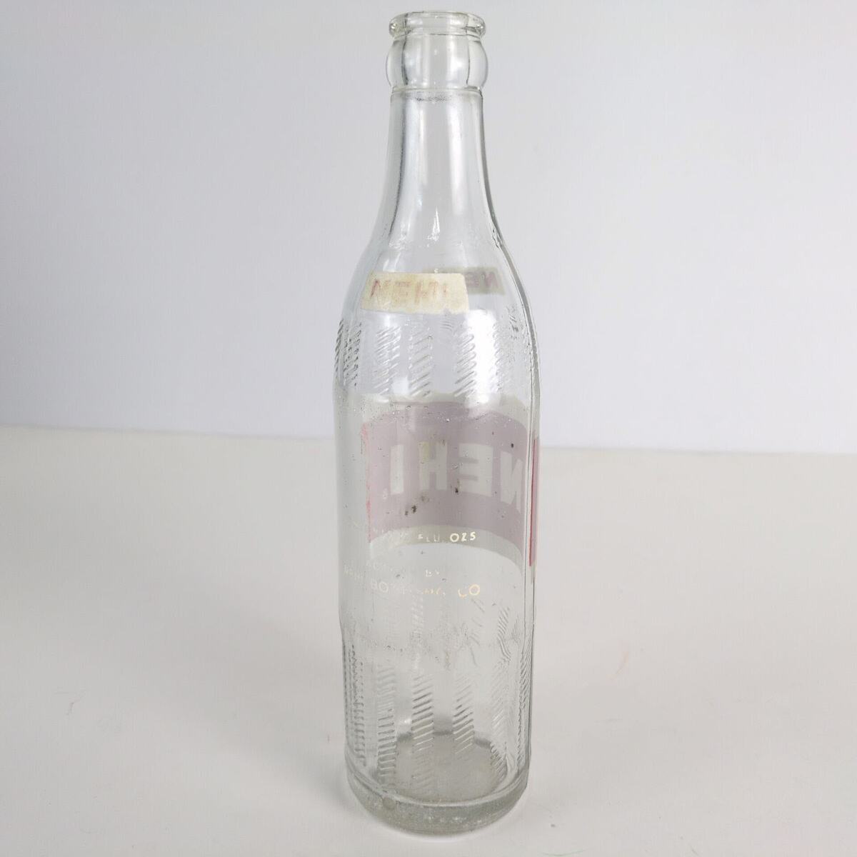 This vintage soda bottle is for Nehi Soda and features red and white ACL graphics. The 12oz bottle is made of clear glass with striped lines around the center. The mold number on the base was G-18089. Dates from around the late 1940s early 1950s era.