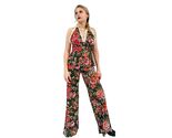 Vintage Retro Authentic 1970s Green Floral Slinky Nylon or Polyester Halter Top High waist wide leg Pant Set. The top features adjustable ties at the neck, a front closure secured by charming white plastic flower buttons, and is adorned with white eyelet trim. It is lined in the bust and has a subtle peplum design. The pants are designed for easy wear with a pull-on style and an elastic waistband. This set is available in size XS; the model, who wears size XS, finds it to fit her comfortably. In clean excellent condition.