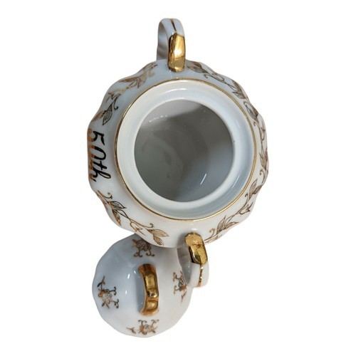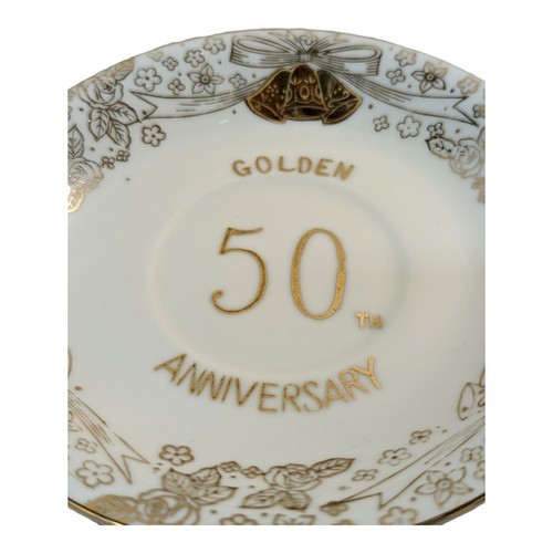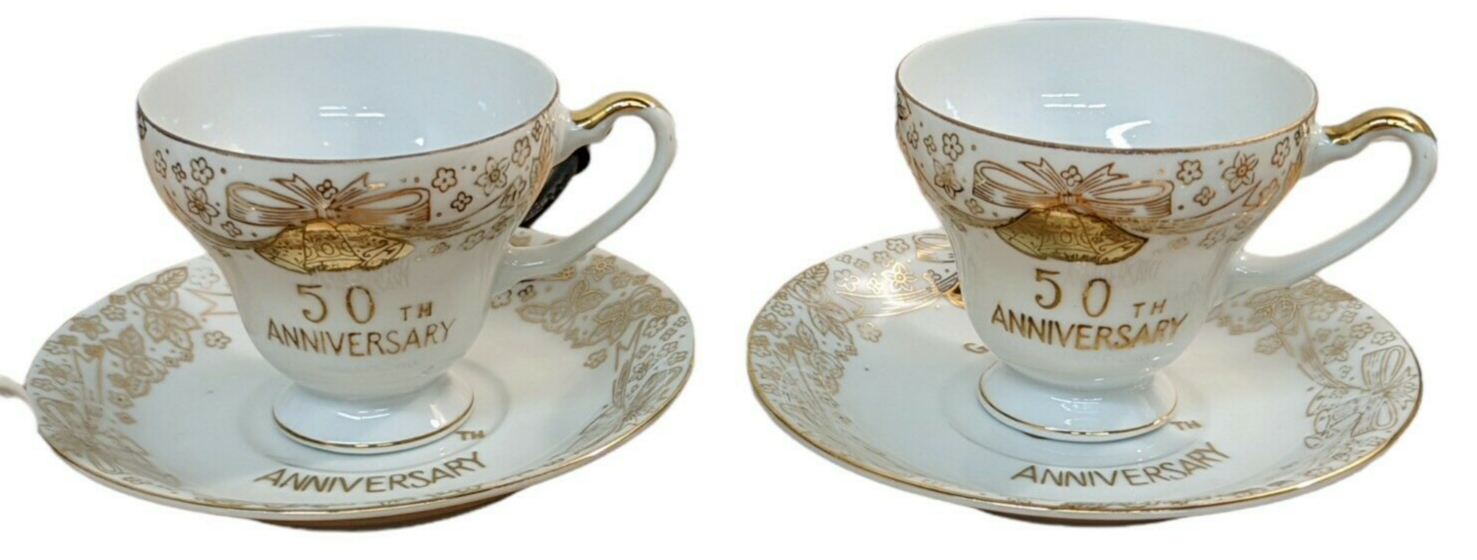 - Vtg 7pc Set 50th ANNIVERSARY Cream & Sugar Bowl Tea Cups & Saucers Gold Japan