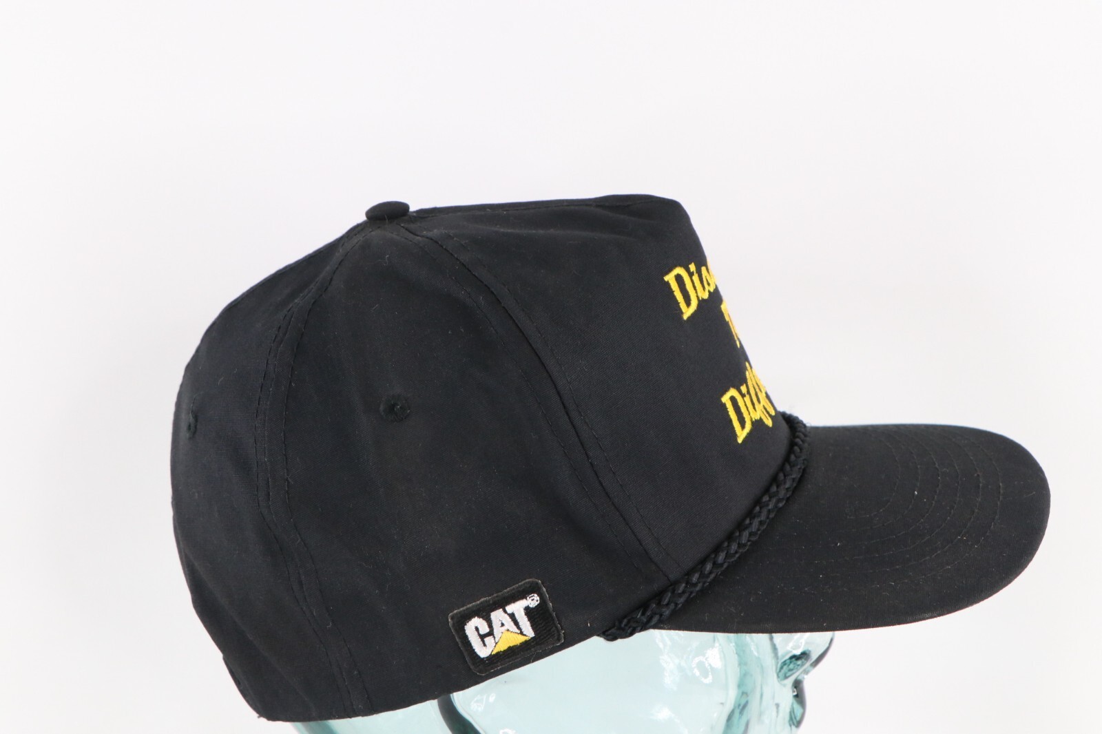 - Vtg 90s Cat Caterpillar Discover Difference Spell Out Roped Snapback Hat Black