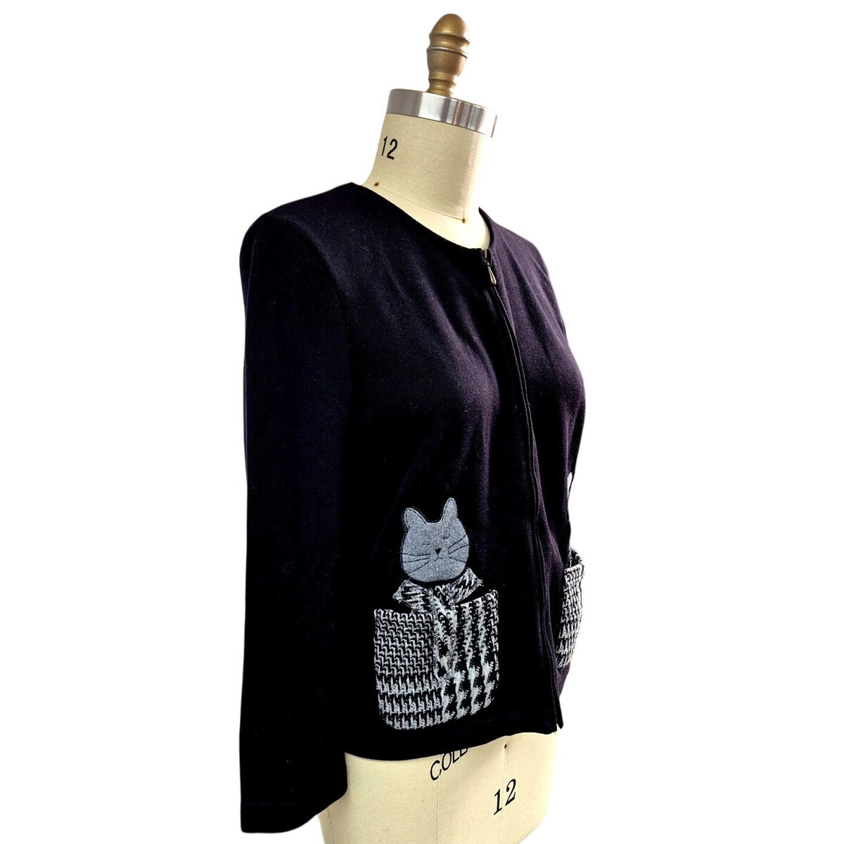 Vtg 90s Onque Casuals Cotton/Poly Black Zip-up Sweater Kitties with Scarves Pockets - so cute and Cat Lady ready! Grandma's style and size M are in very good condition.