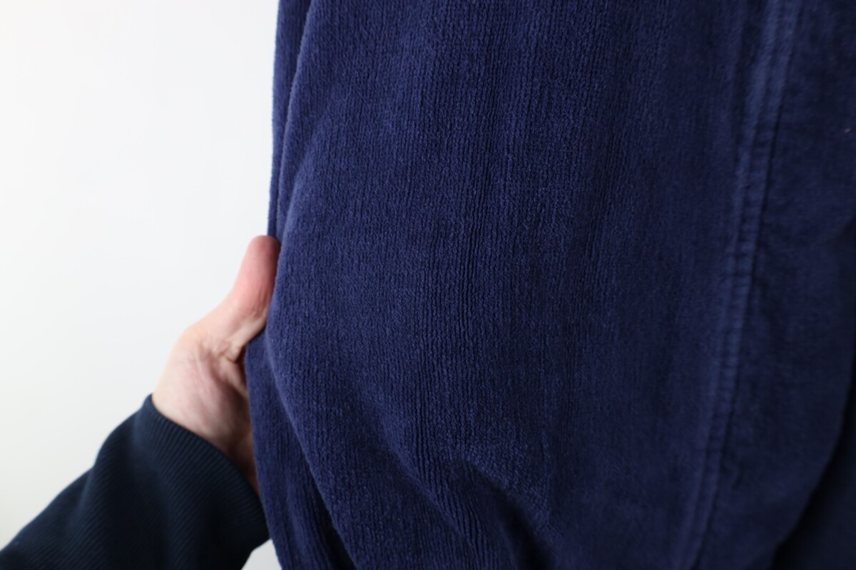 Dark spots/blemishes front, back. Cuffs, strap discolored. Loose threads left pocket, inner collar, bottom hem. Color faded. Pilling