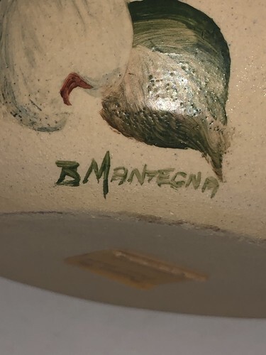 This vintage handmade pottery pitcher features a beautiful floral design with painted dogwood flowers, signed by the artist B Mantegna. Standing at 4.5 inches tall and 5.5 inches in diameter, this unique piece is made of clay and glazed in a multicolor finish. The decorative pitcher exudes a charming country style, making it a lovely addition to any home decor. Made in the United States with a painted backstamp, this original art pottery piece is both functional and visually striking.