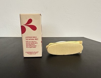 The product is a vintage Avon nail buffer with its original instructions and packaging, made in the United States. This collectible vanity accessory is designed to smooth and buff nails to a shiny finish, providing a convenient and effective way to maintain beautiful nails. Perfect for any nail enthusiast or collector of vintage beauty products, this Avon nail buffer is a unique addition to any collection.
