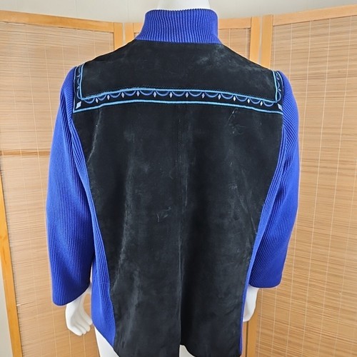 - Vtg Bob Mackie Jacket Woman 2X Blue Suede Embroidered Wearable Art Boho Zip