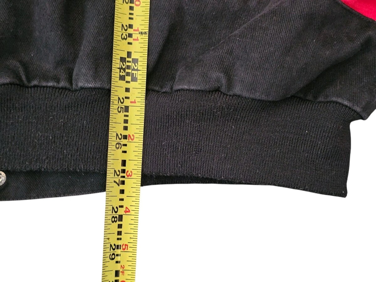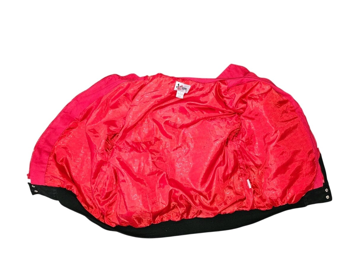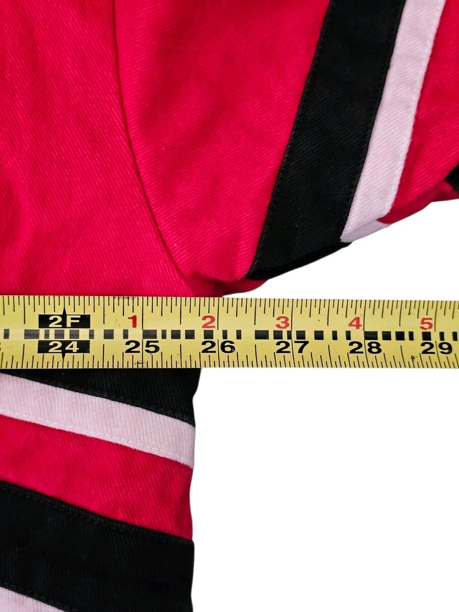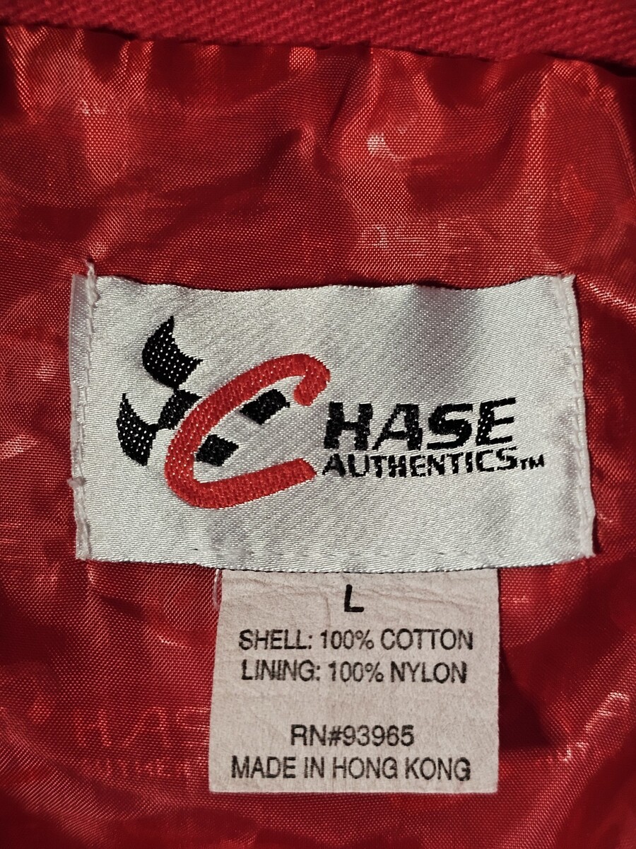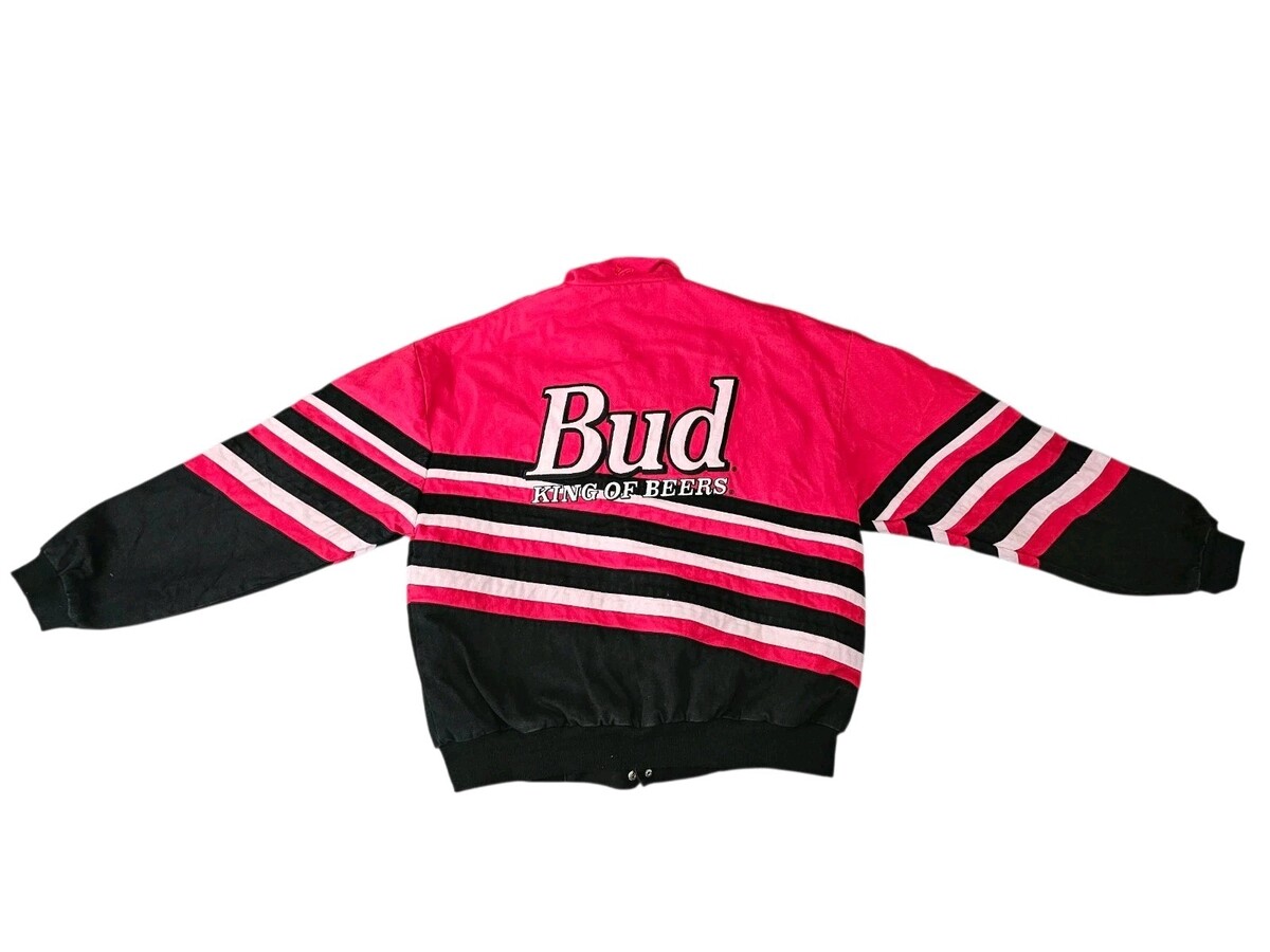 The product is a vintage Chase Authentics men's Nascar jacket featuring a geometric red pattern with an embroidered Budwesier logo. Made of cotton canvas with a polyester lining, this mid-length jacket has a full zip closure and is machine washable. The jacket is in size XL and is designed for casual occasions, showcasing accents such as a zipper pull, embroidered logo, and various pockets. With a theme centered around cars, 90s beer culture, this jacket is a unique addition to any wardrobe, perfect for fans of NASCAR and classic American style.
