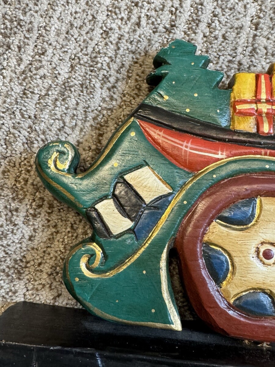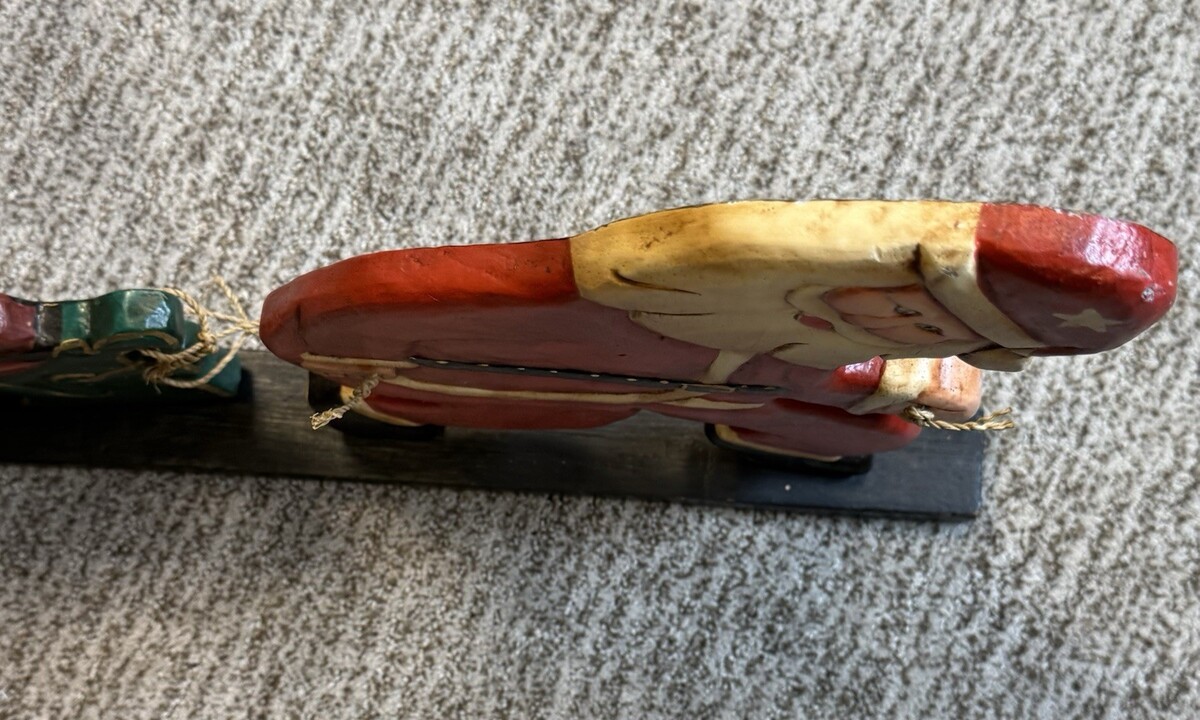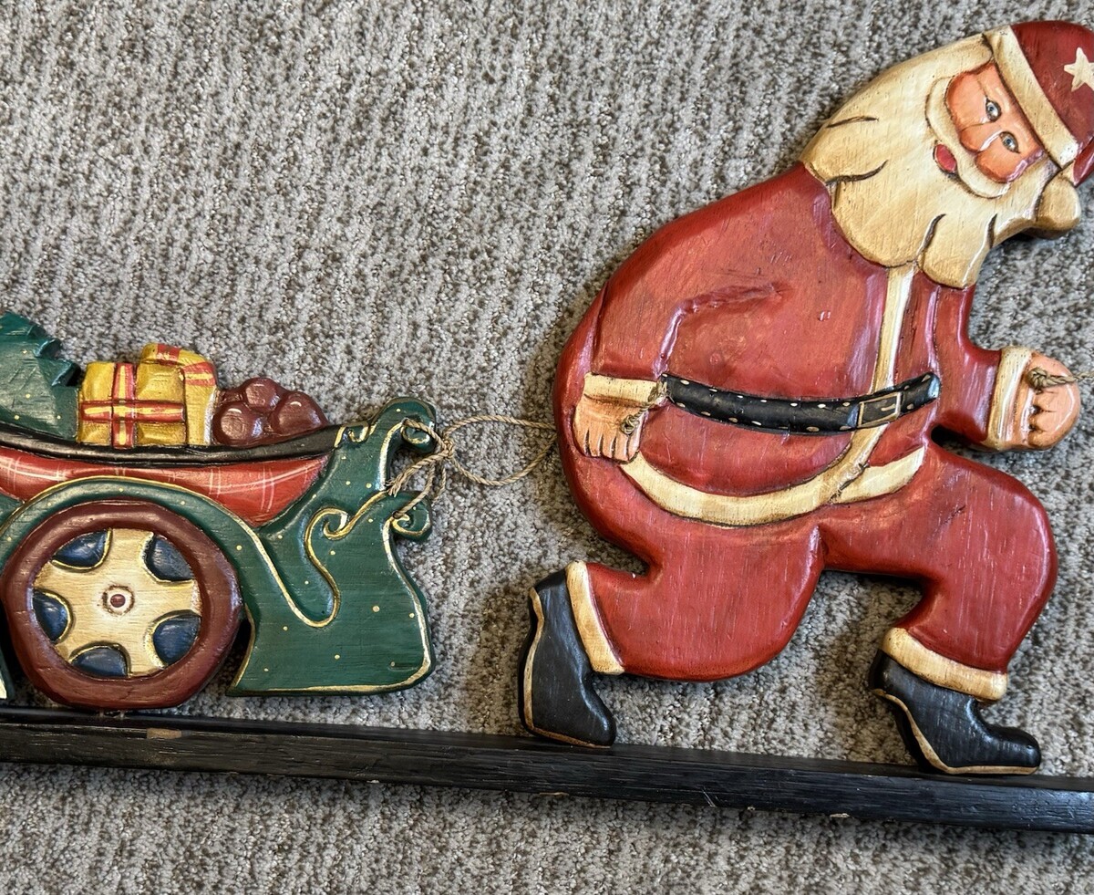 - Vtg Christmas Folk Art Santa Sleigh Display Hand Carved Wood Painted 22" Decor