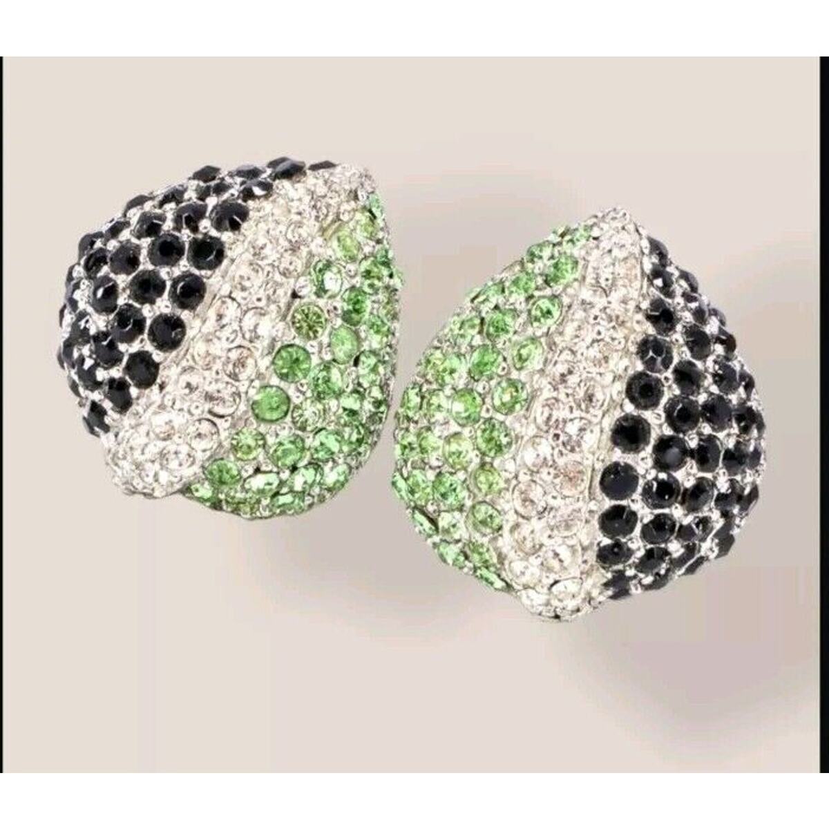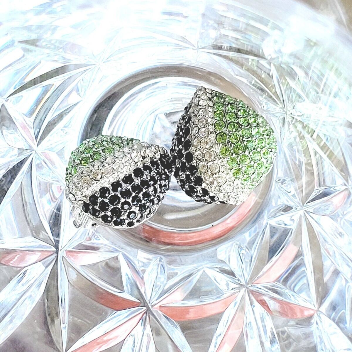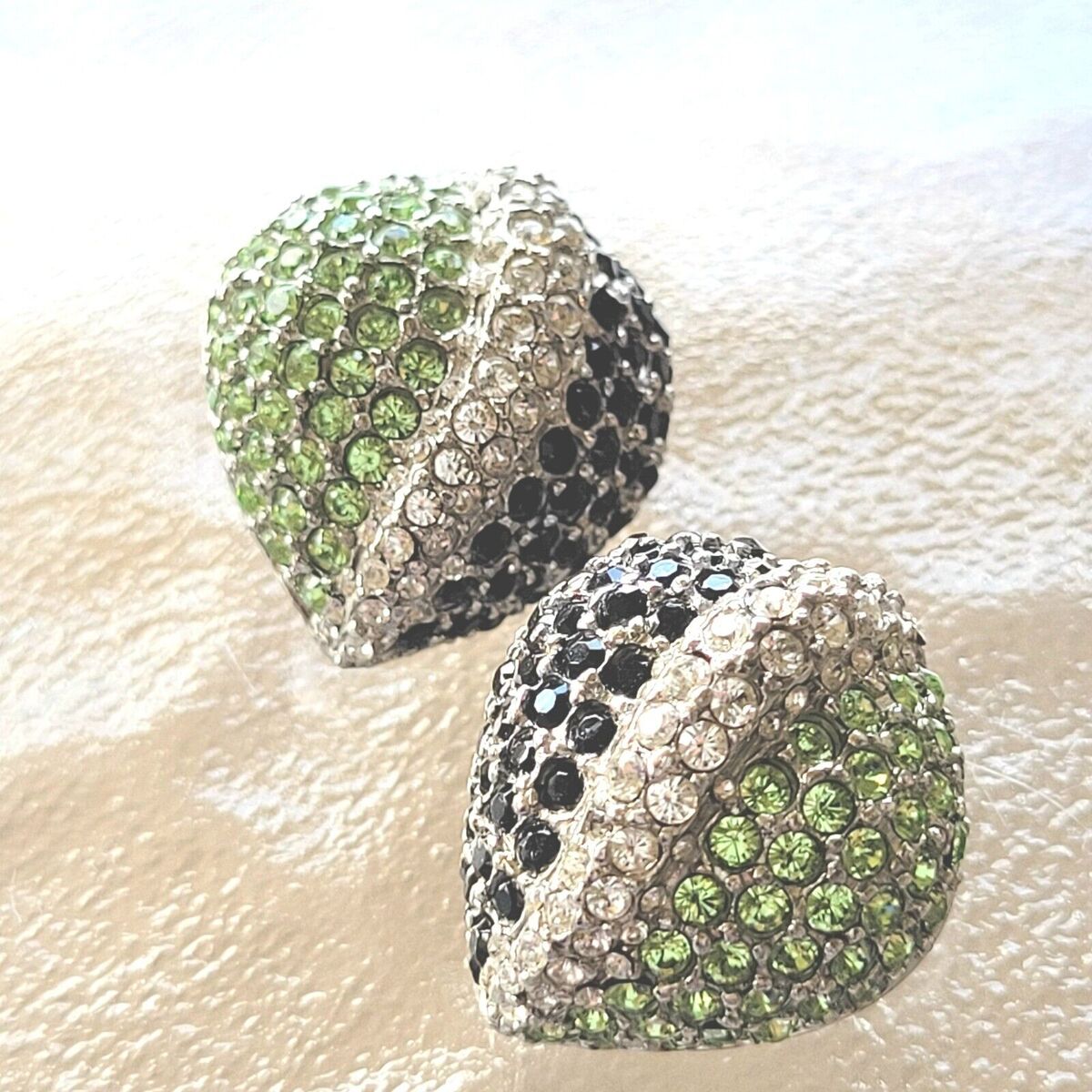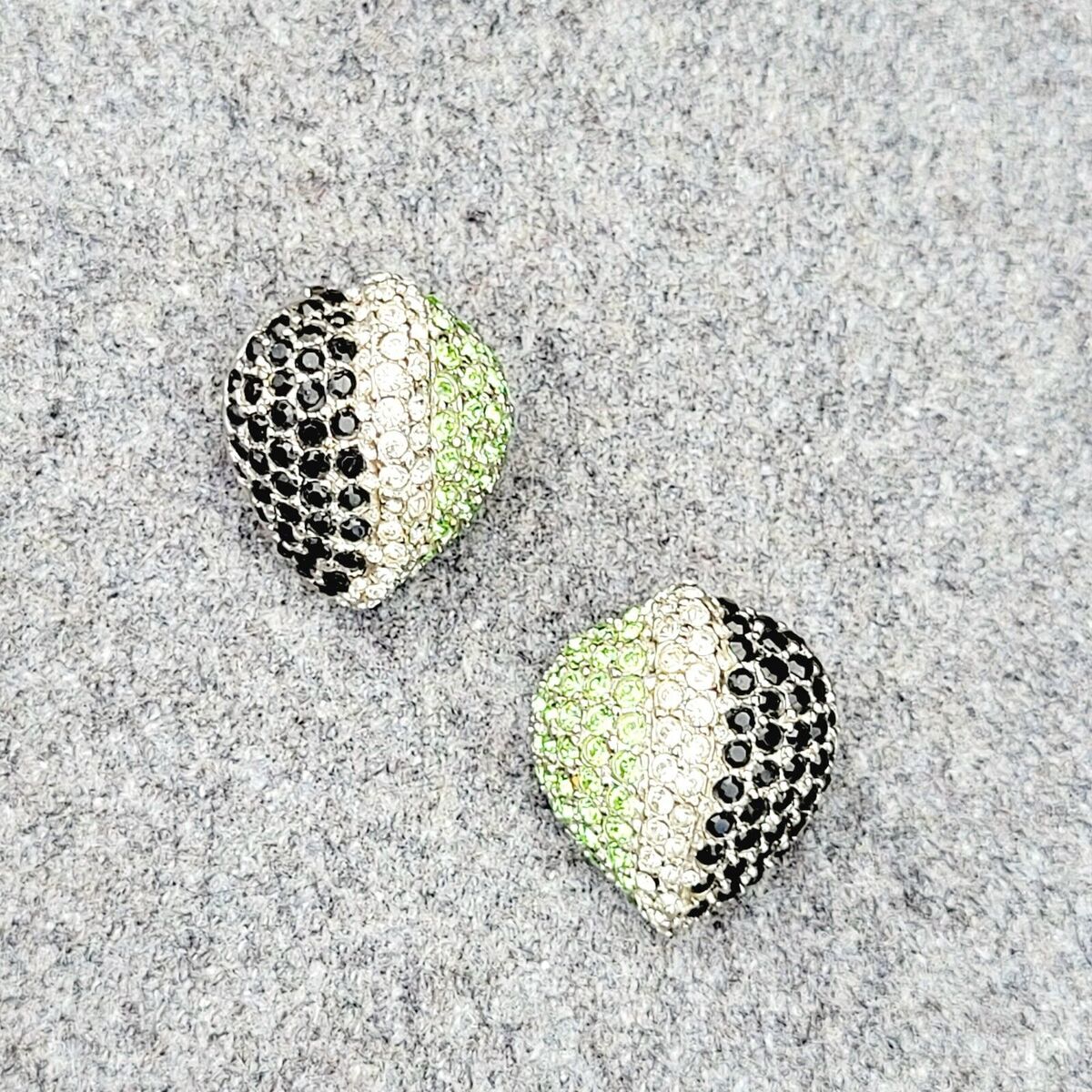 - Vtg Ciner signed Silverplate Lime & White Black Crystals Almond Earrings Clip On