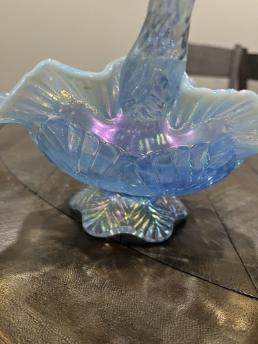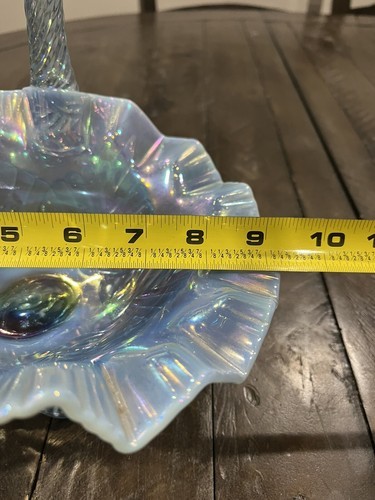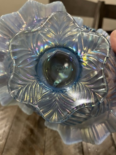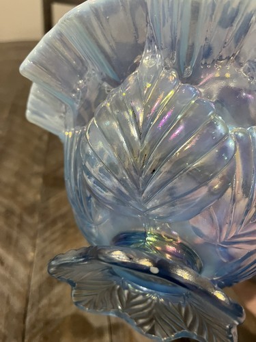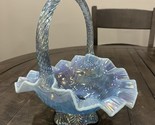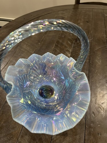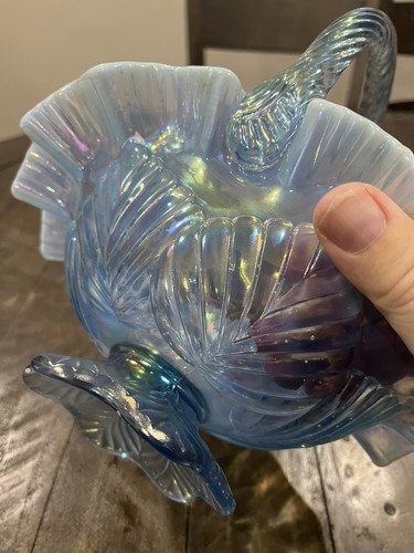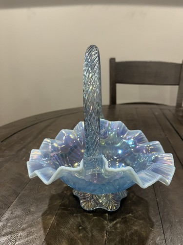 - Vtg Fenton Basket Blue Iridescent Opalescent Fan Scalloped Glass Crimped 9.5"