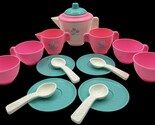 Includes Teapot with Lid, 4 pink cups, 4 aqua plates, 4 white spoons, pink creamer and sugar bowl