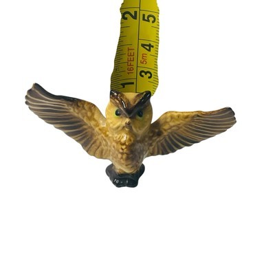 The product is a vintage Hagen Renaker owl miniature figurine made of brown porcelain with wings spread. This small figurine is part of the Animals collection and depicts an owl in a glossy finish. Made in the United States during the late 20th century, this original piece is perfect for all occasions and would make a charming addition to any art-themed decor. With its detailed craftsmanship and iconic design, this owl figurine is a must-have for collectors of decorative sculptures and figurines.