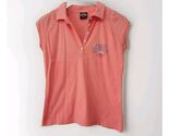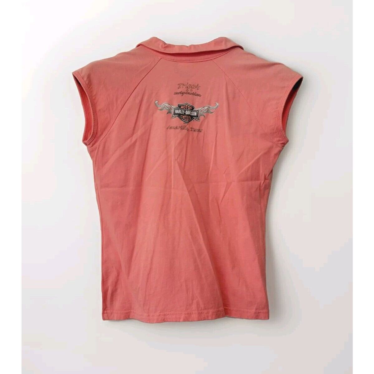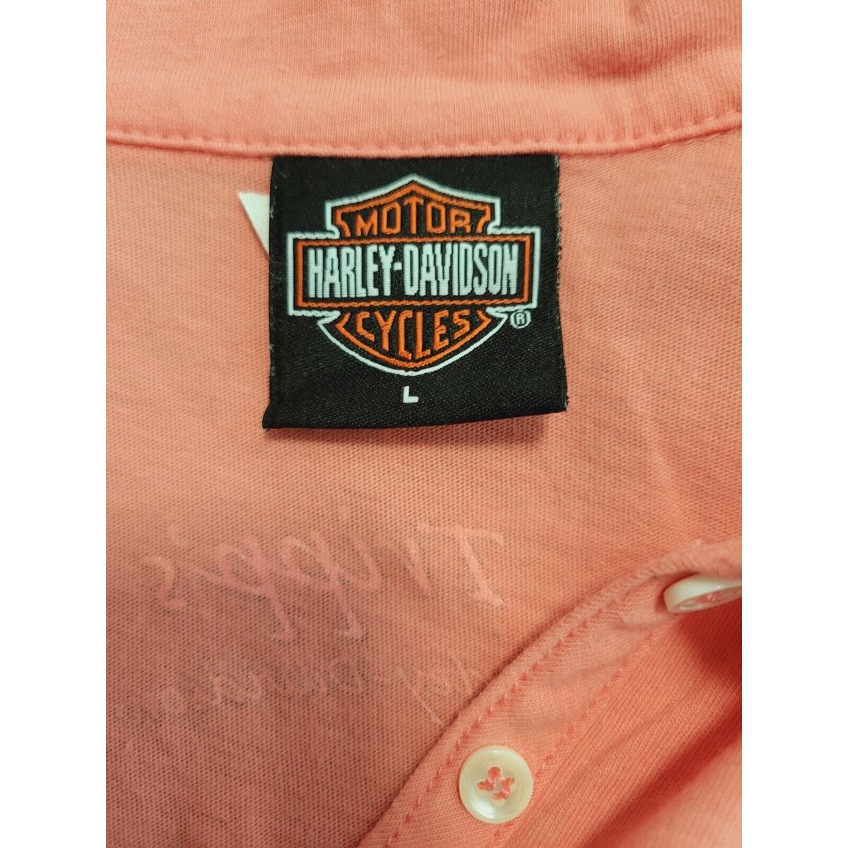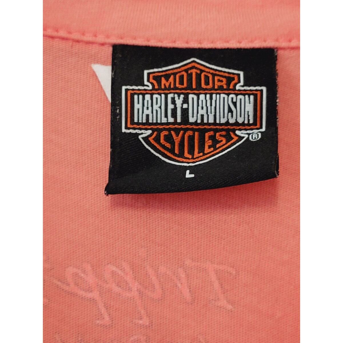 This vintage Harley-Davidson graphic tee is a women's top in size large, featuring a retro Texas orange color with a classic Harley Davidson logo on the front. The shirt has a scoop neck and short sleeves, made from 100% cotton fabric for easy care and comfort. With a slim fit and a solid design, this casual t-shirt is perfect for all seasons and is machine washable for convenience.