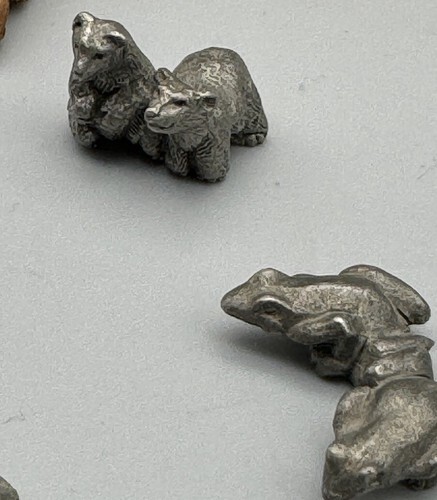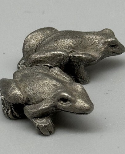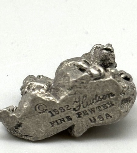 There are six (6) pewter animal pairs marked "Hudson" and "1982" and one (1) Noah figure. The animals are as shown in pictures and include frogs, gorillas, lions, bears, and some are unidentified. There is also a tiny single turtle in silver tone (metal unknown). The turtle is marked but hard to read (see photos).