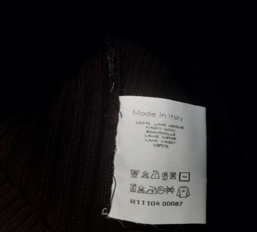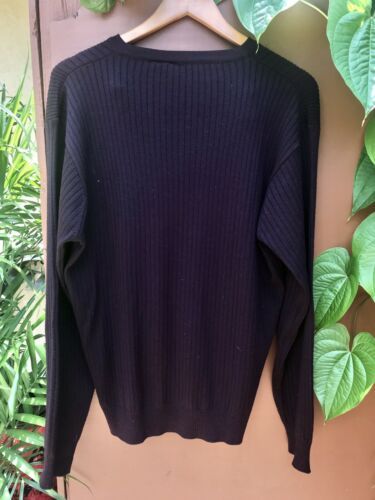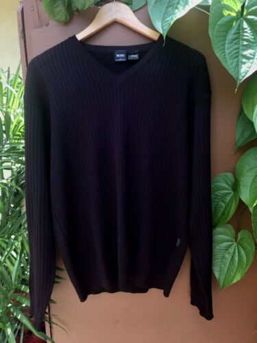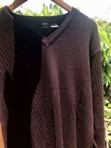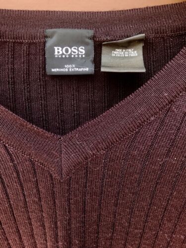Beautiful men?s vintage BOSS by Hugo Boss V-Neck slimline sweater made of 100% virgin wool in Italy. It is SO tough shooting the color, but it is a very dark purple ? these photos were all taken in natural light and vary in looking purple to brown to black but it?s a very dark purple color.
