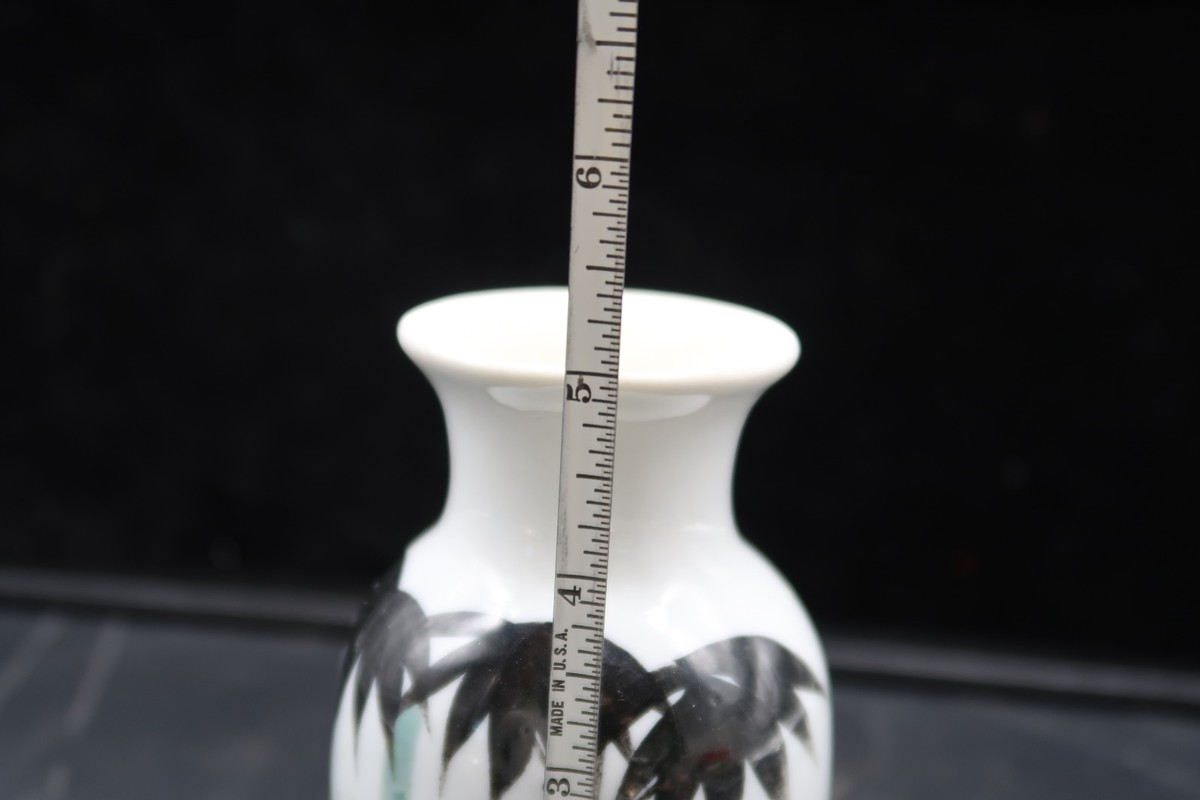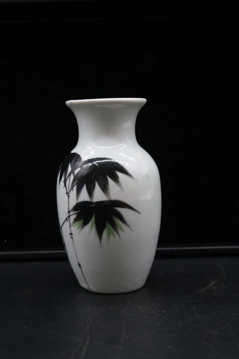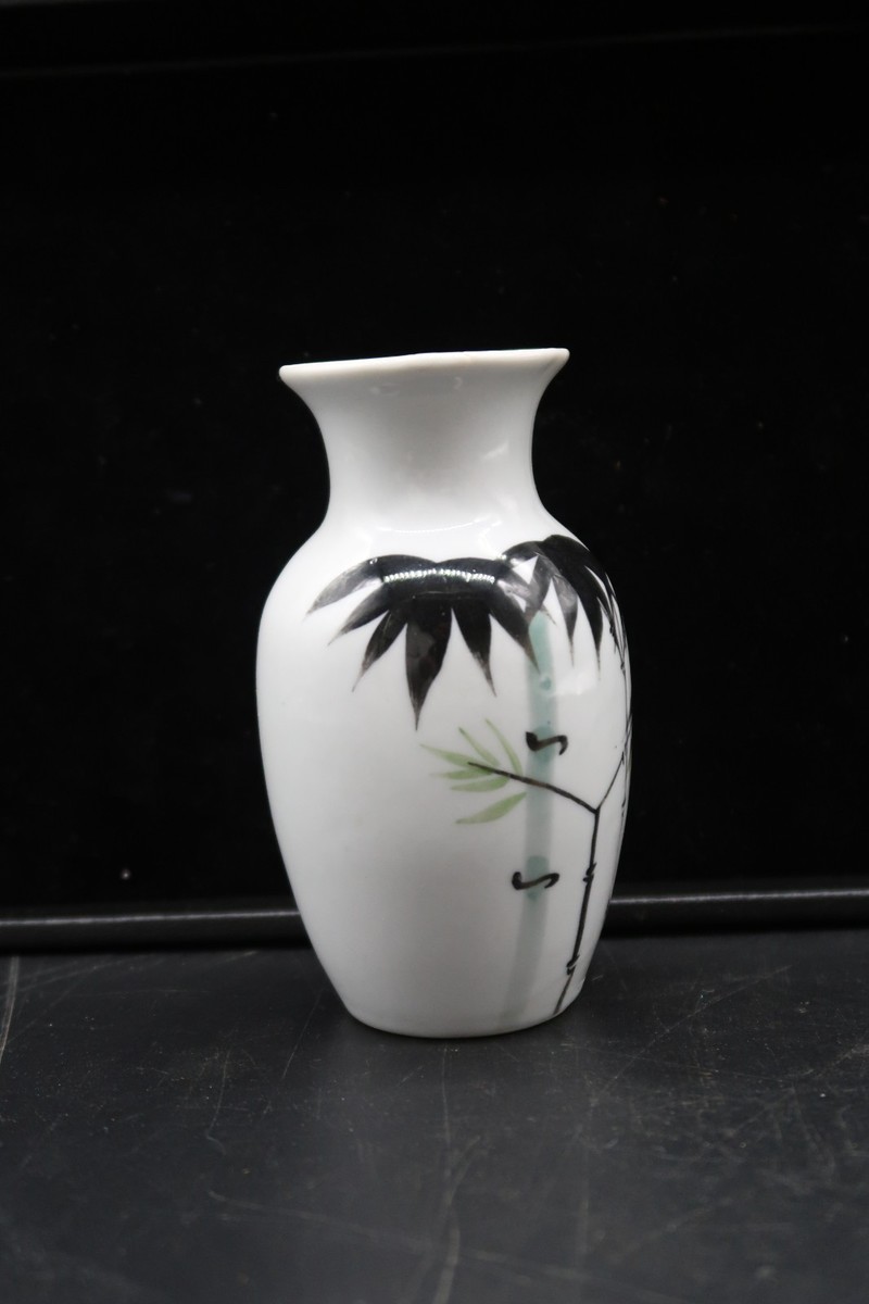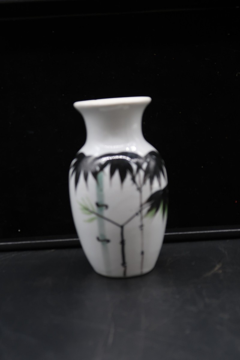 - Vtg Japanese Chinese Black White Vase Bamboo Trees Signed Symbols AA Imports