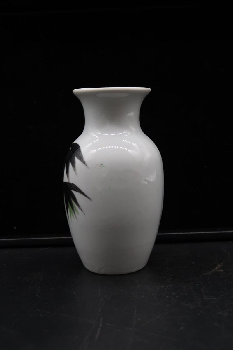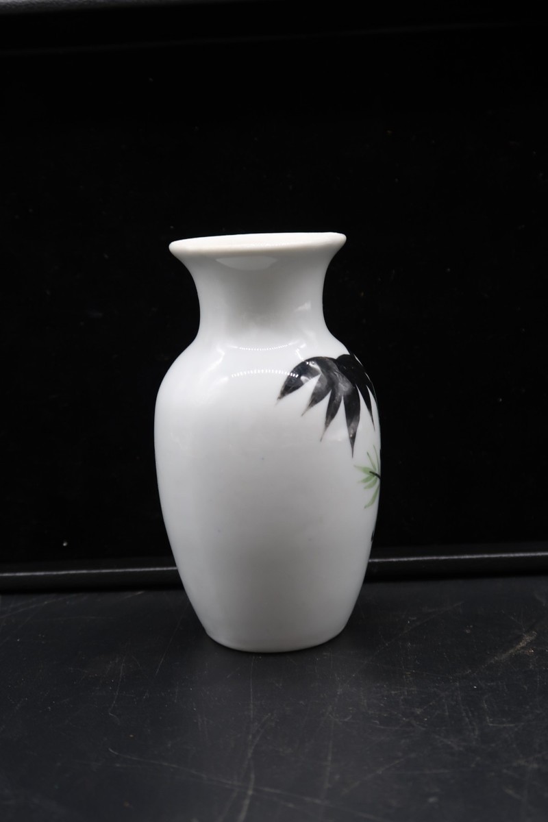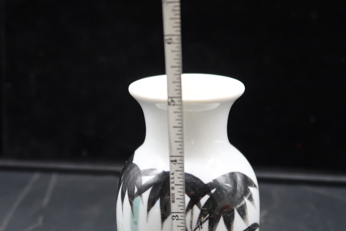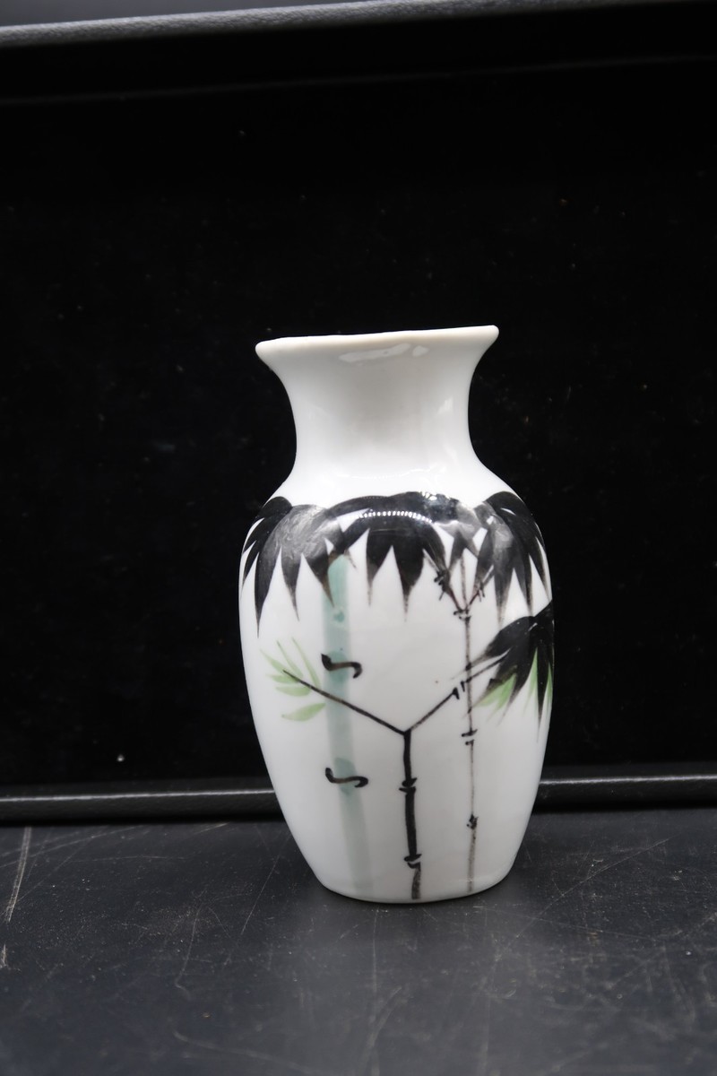 - Vtg Japanese Chinese Black White Vase Bamboo Trees Signed Symbols AA Imports