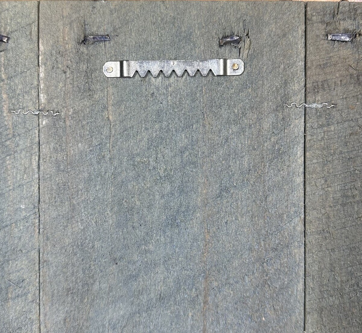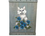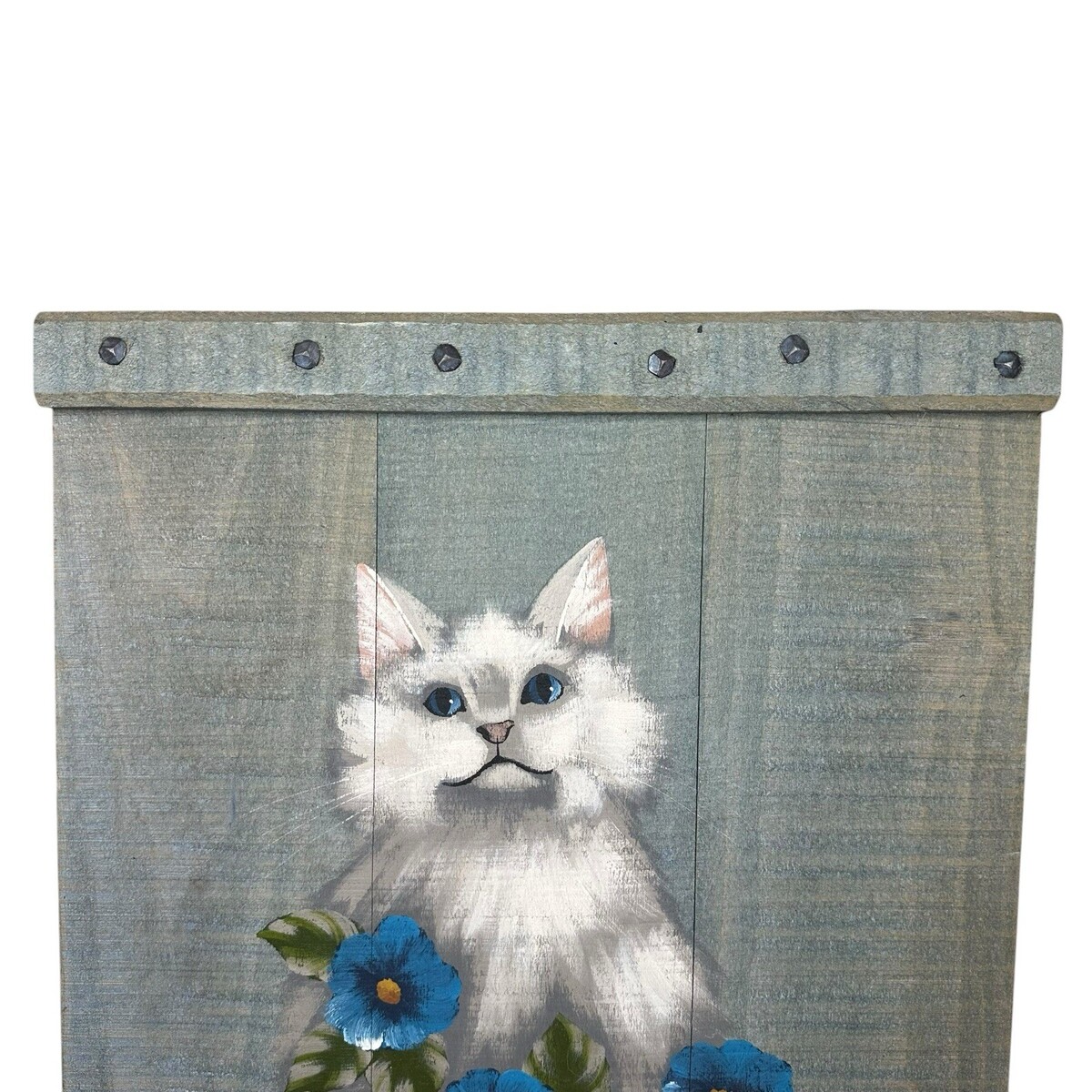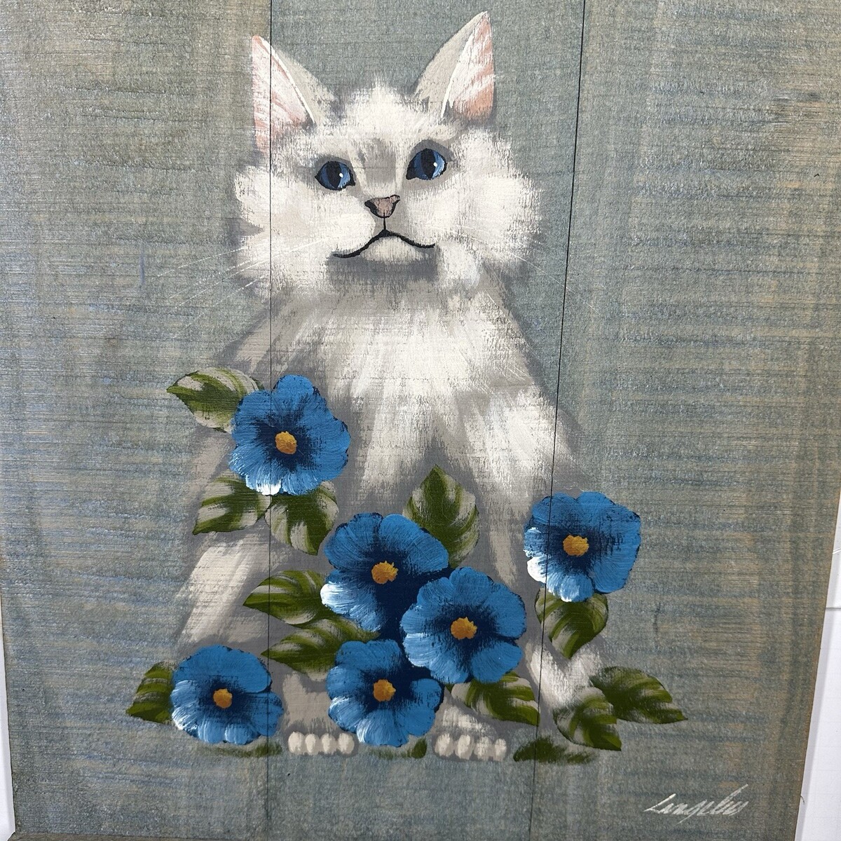 Vintage Joyce Langelier Hand Painted White Cat with Blue Flowers on Gray Wood Signed 15.5" x 13.5"