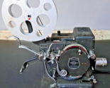 The projector takes up to 400 feet of 16mm film, it can run films backwards, and has a still-picture device.
