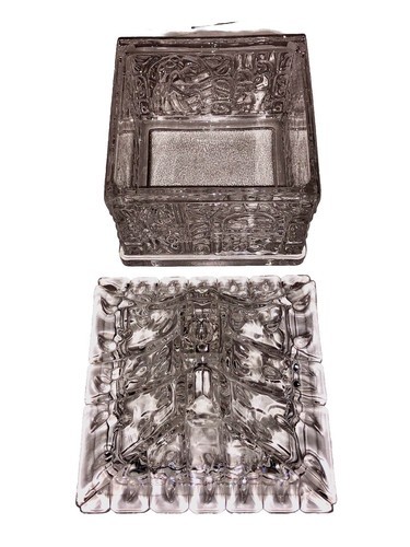 This product is a vintage lead crystal Hansel Gretel gingerbread house candy dish, featuring a clear glass design with a decorative and intricate Hansel and Gretel theme. Originating from Germany, this studio-crafted art glass piece is perfect for displaying and serving candies or other small treats. The unmarked brand adds to its unique appeal, making it a charming addition to any home decor or collection.