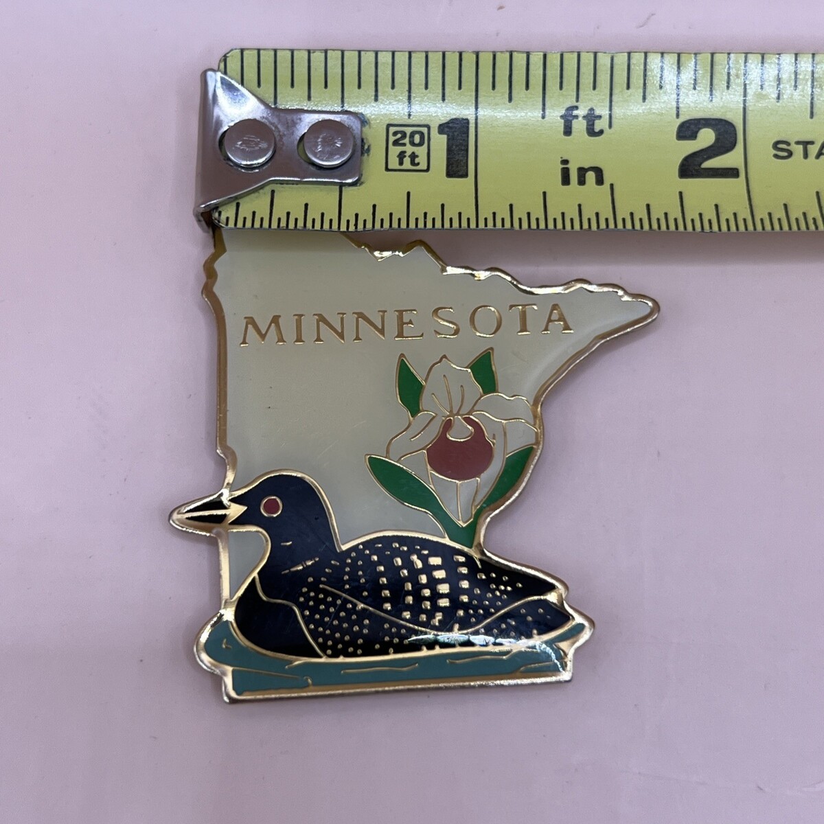 This vintage Minnesota souvenir metal refrigerator magnet features a cute duck and flower design, perfect for adding a touch of charm to your kitchen decor. The multicolor magnet measures a little less than 2 inches in length and width, making it a unique and decorative addition to your collection. The souvenir item showcases the state of Minnesota's attraction, making it a special keepsake for fans of the region. Made of metal, this magnet is durable and long-lasting for displaying on your refrigerator or any other magnetic surface.