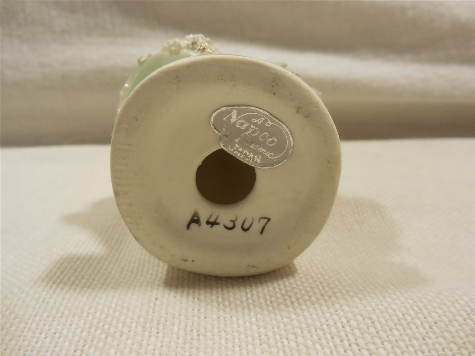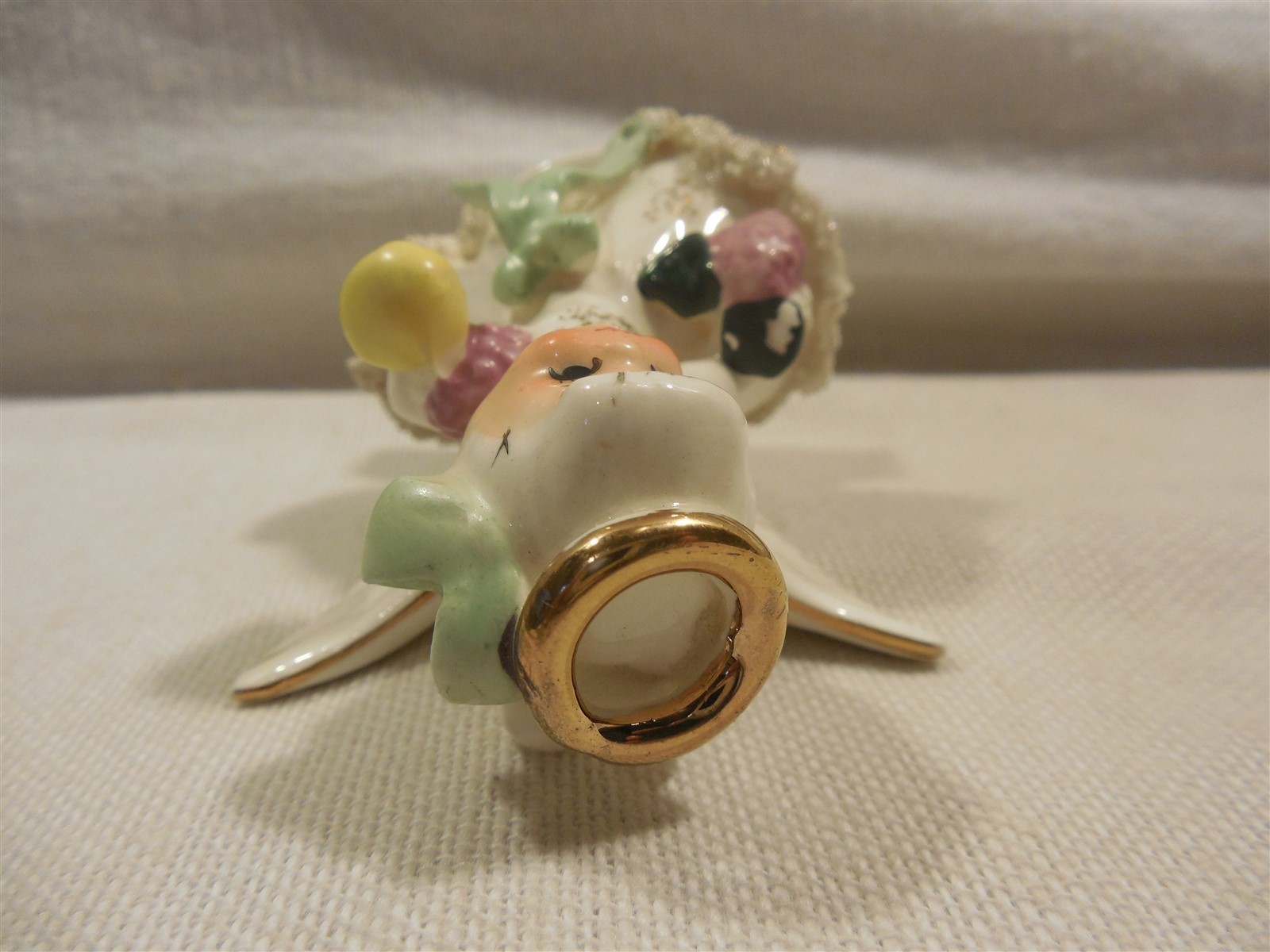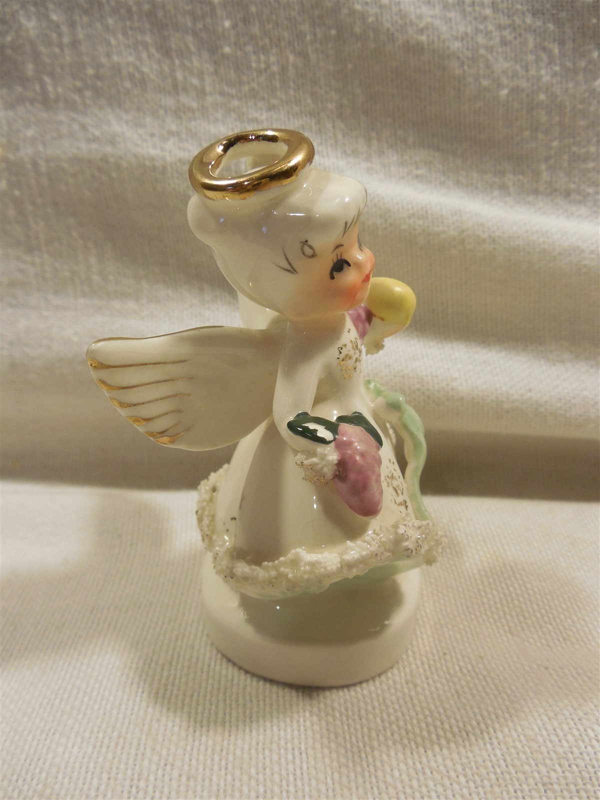 This is a vintage Napco Japan Ceramic November Birthday Angel Girl figurine (A4307). The girl is holding fruit in her hands - green bow on her dress and in her hair - lots of spaghetti trim around the bottom of the dress - the front of the base is marked November in gold. The original silver foil Napco Japan label is attached to the bottom and is marked A4307. The figurine measures approximately 3 1/4" tall and 2 1/4" wide. Nice clean cute Napco Japan ceramic November birthday angel girl figurine that displays absolutely great when sitting on a shelf!