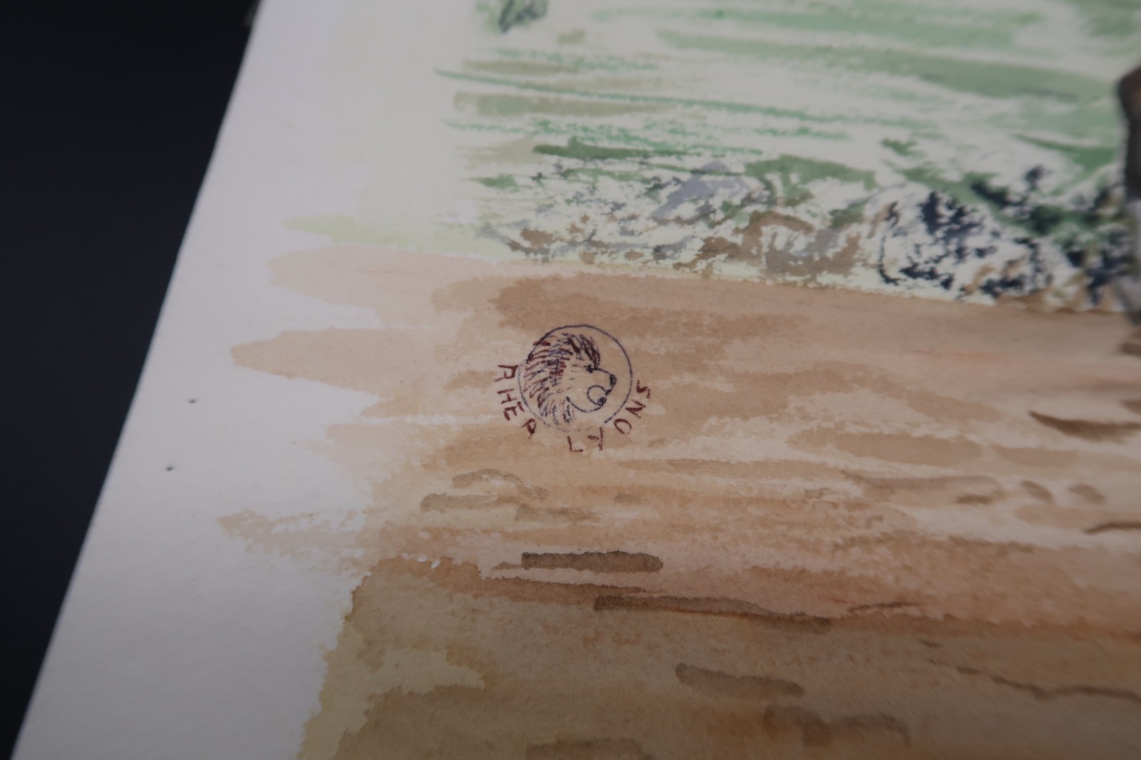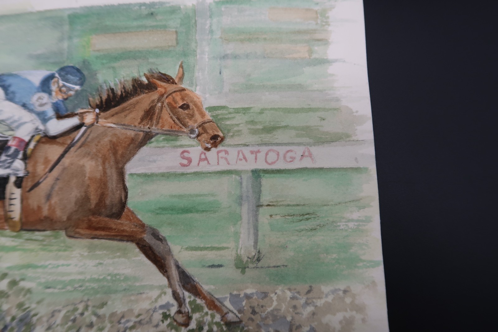 Stamped /Signed Rhea Lyons. A beautiful watercolor scene of Saratoga Racecourse. Wear and imperfections consistent with age and being handled. Please carefully examine all pictures before purchasing. The pictures are an important part of the description, and usually include important measurements. Items are in good pre-owned condition unless otherwise noted.