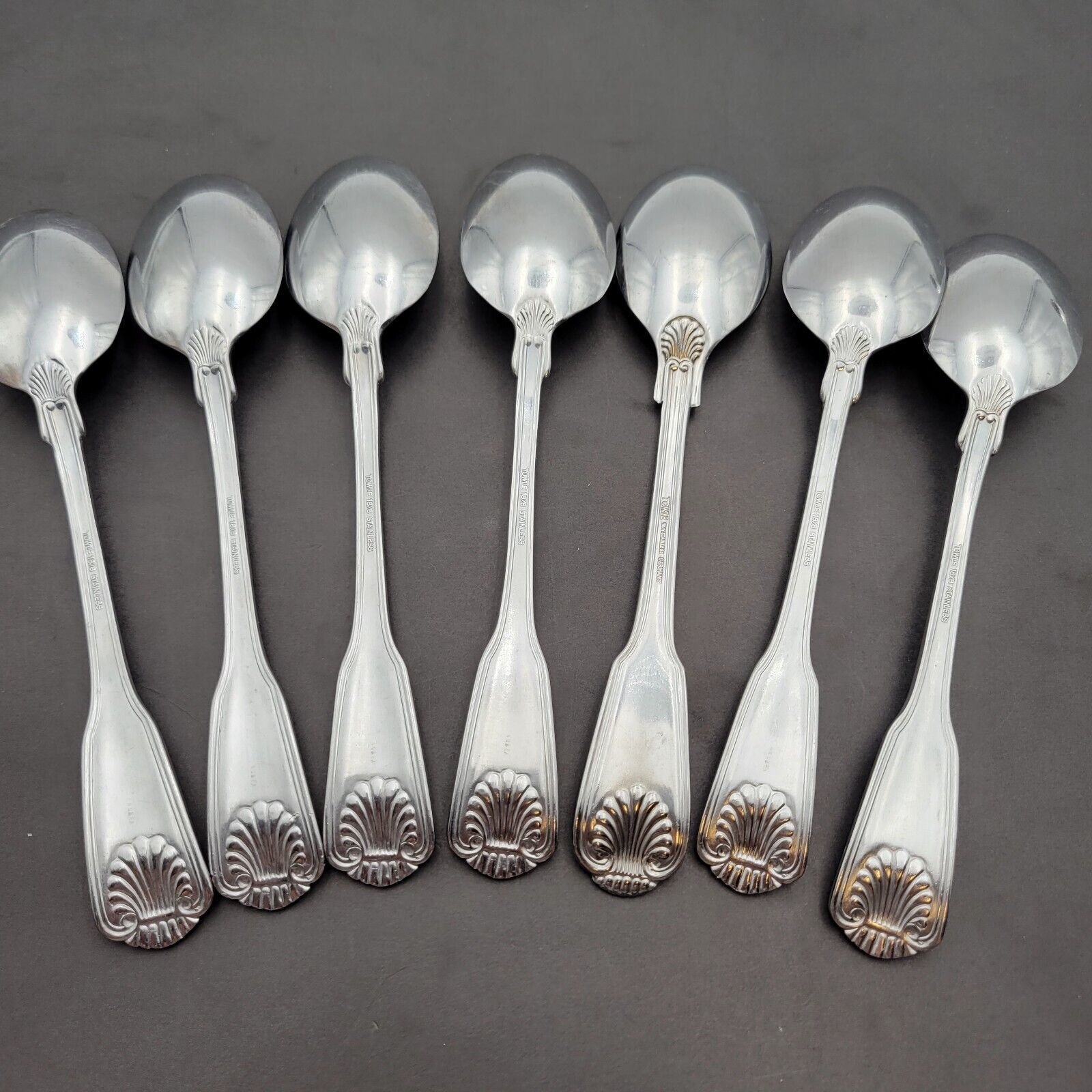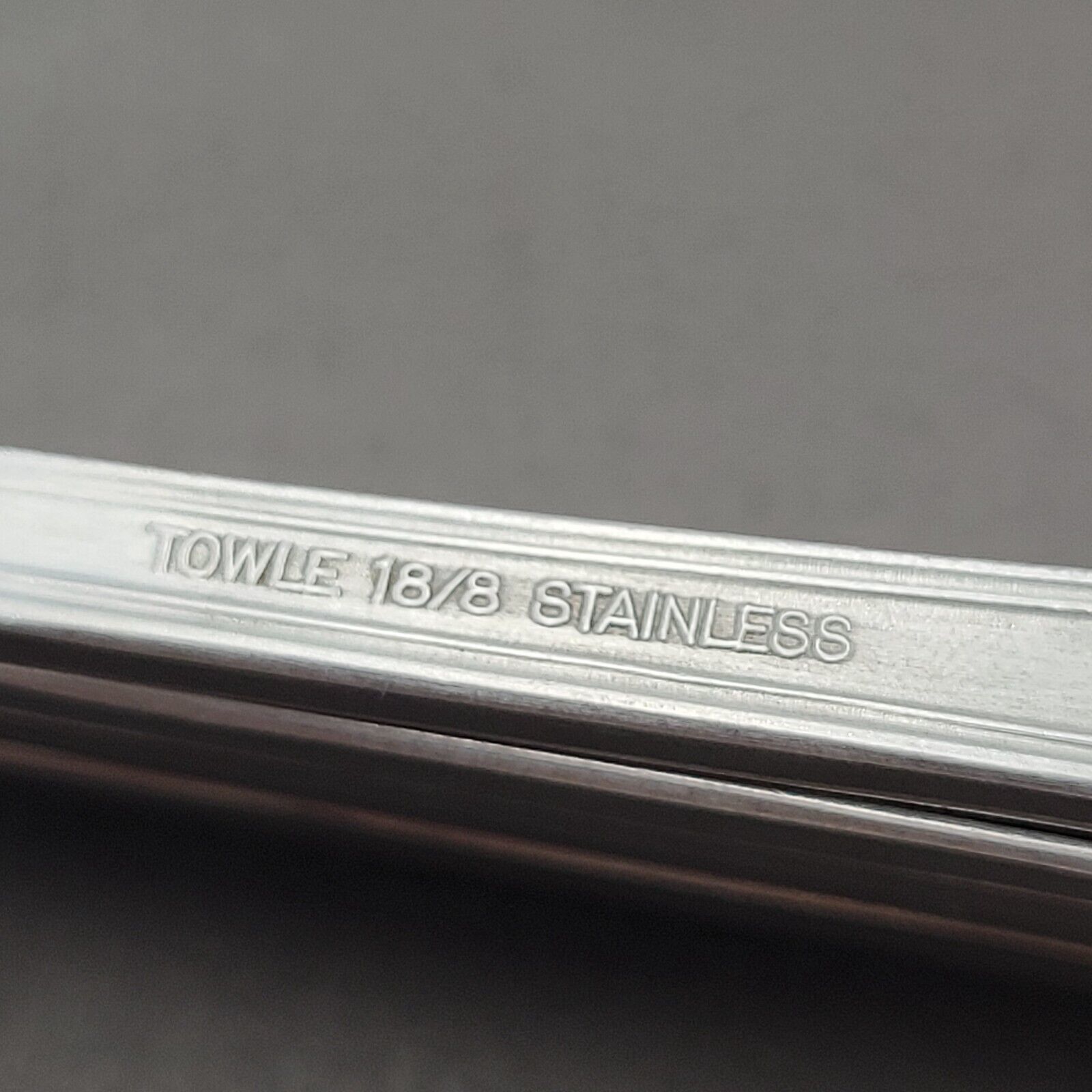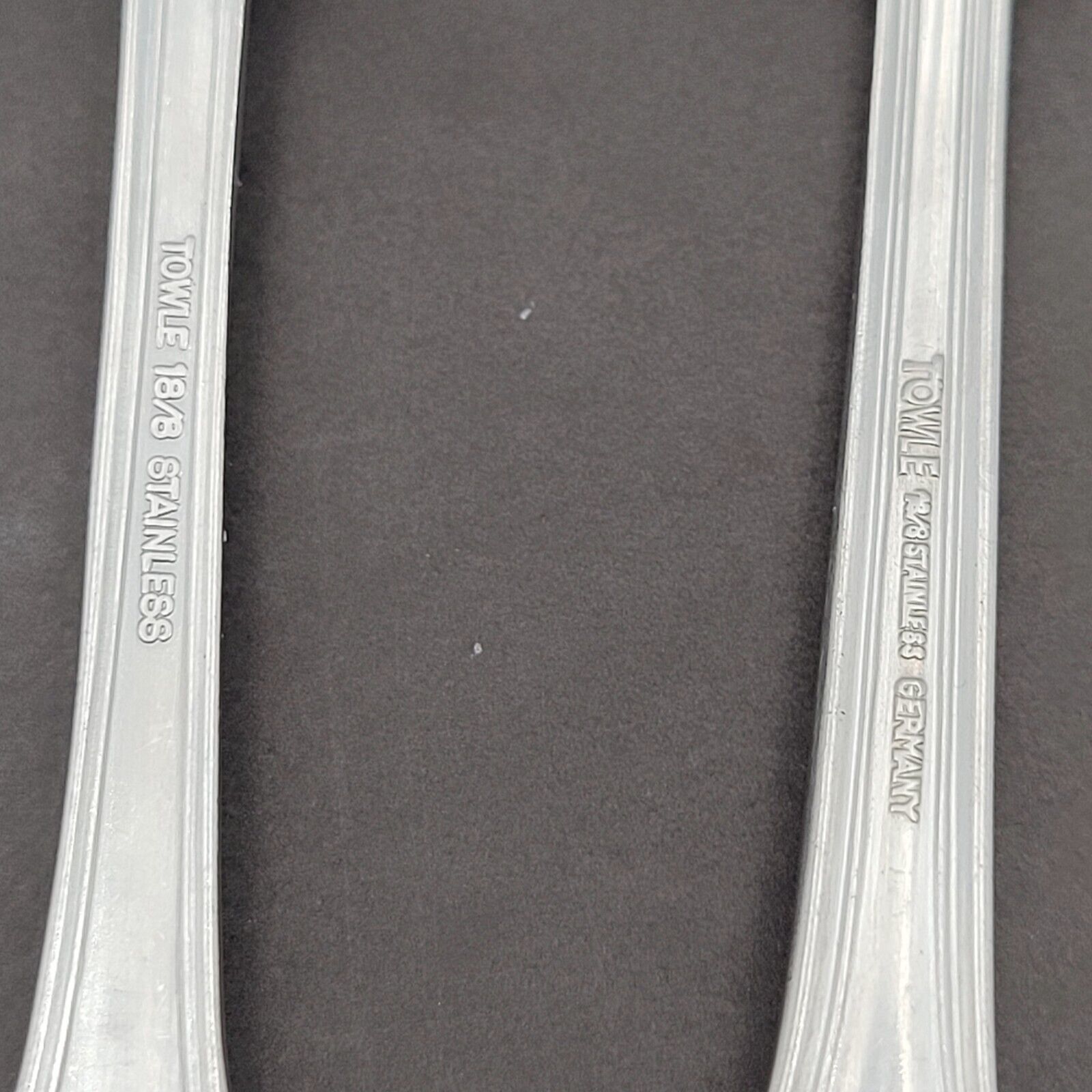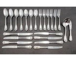 This is a vintage set of 23 pieces of Towle Supreme Cutlery. The set includes knives, forks, and spoons, all made of stainless steel and featuring handles made of the same material. The design is called English Shell and the pieces are silver-plated.
