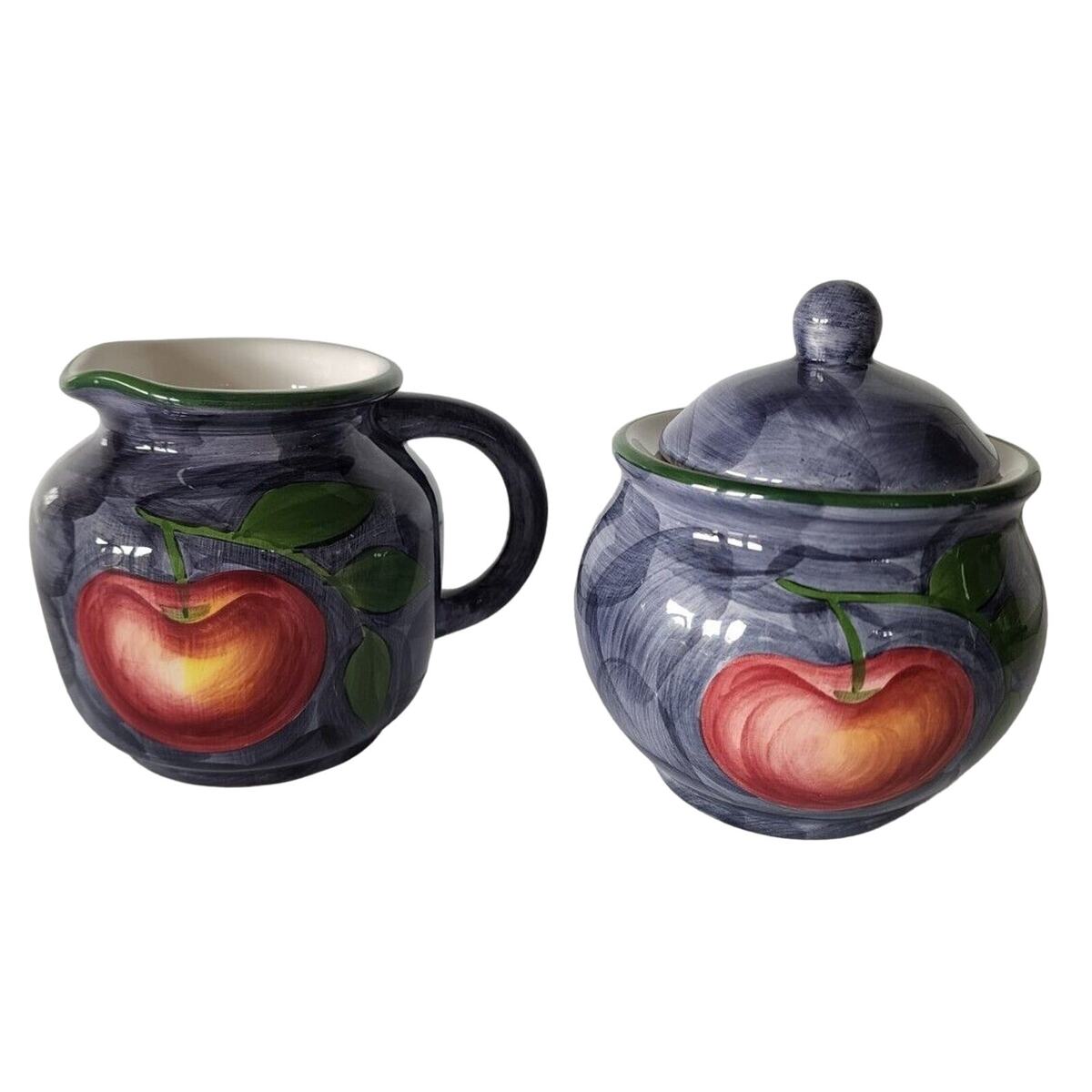 Vintage Tea Set Hand Painted in Thailand ? Teapot Cream Sugar 3 Piece Set. Apple with green leaf stem.