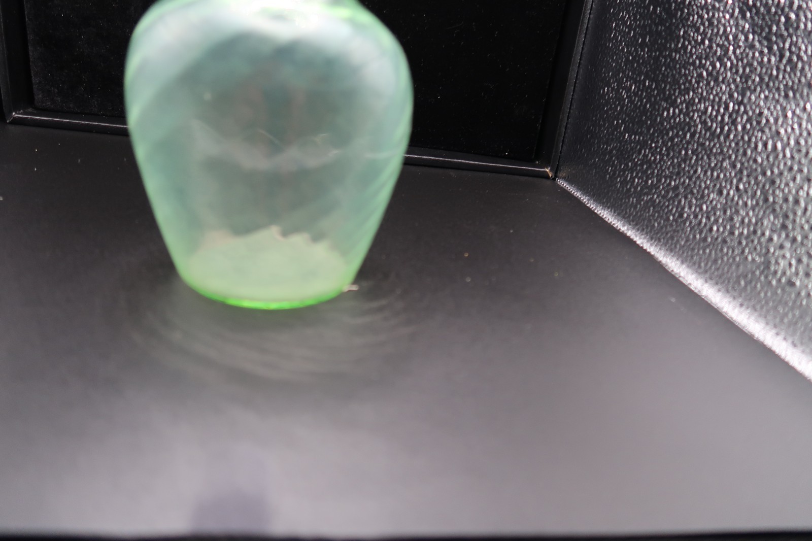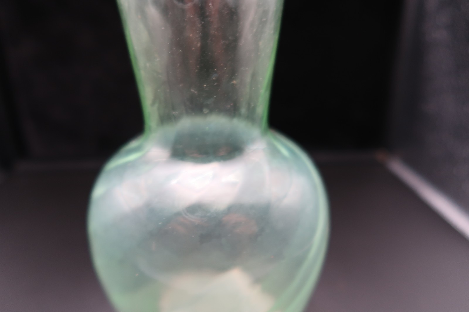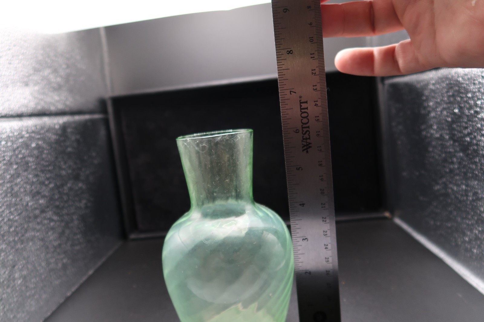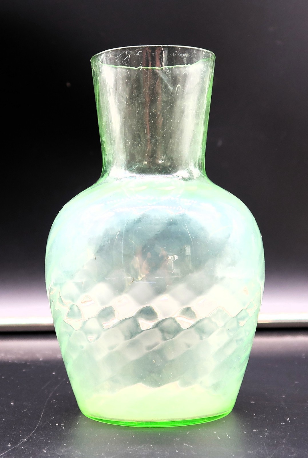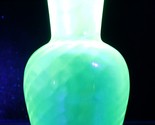 - Vtg Uranium Vaseline Glow Glass 6" w/ Optical Pattern Vase