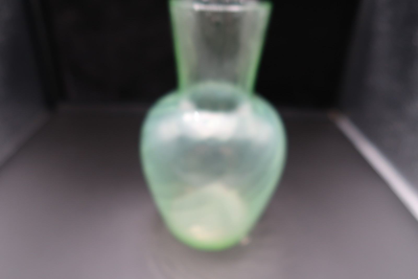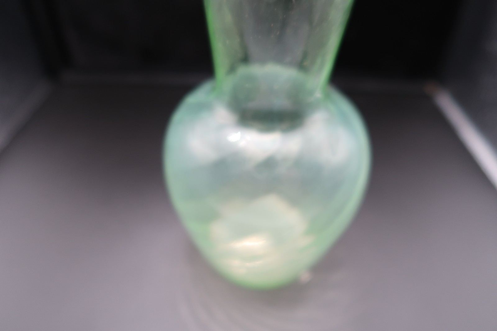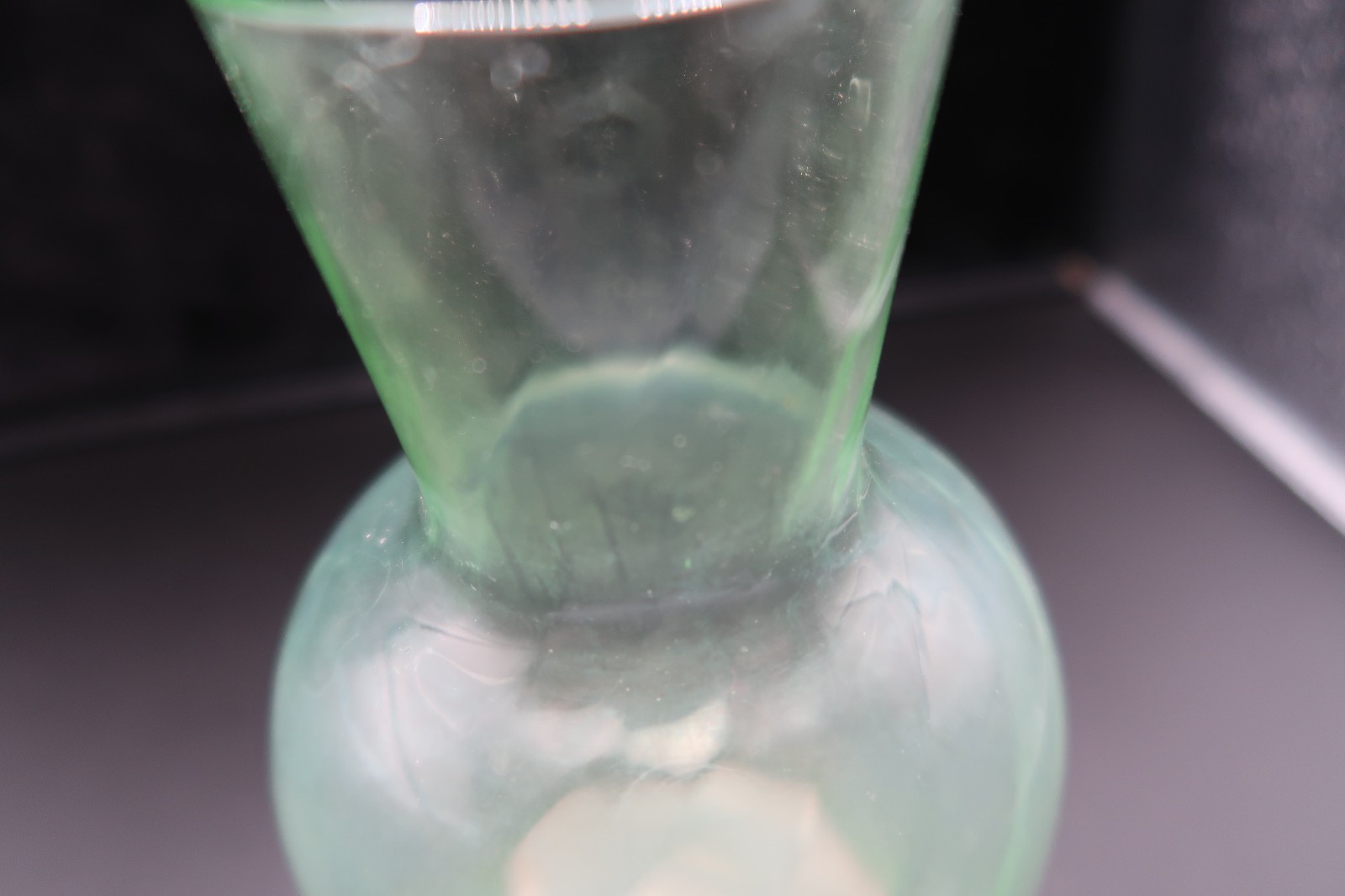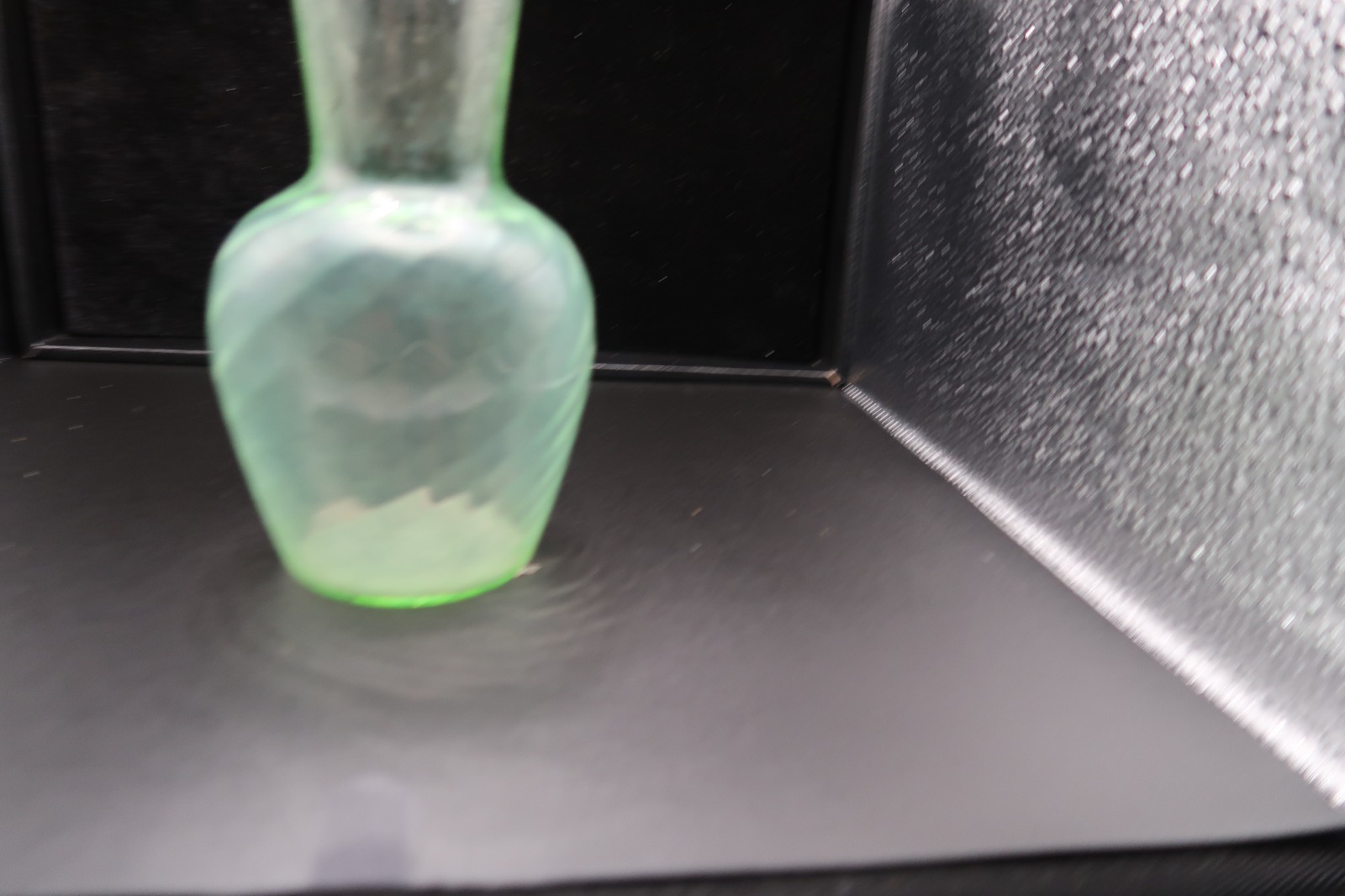 - Vtg Uranium Vaseline Glow Glass 6" w/ Optical Pattern Vase