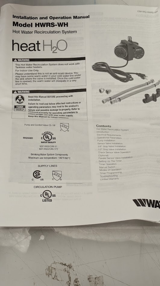 - WATTS Heat H2O Instant Hot Water Recirculation System Pump w/ 12in. Supply Lines