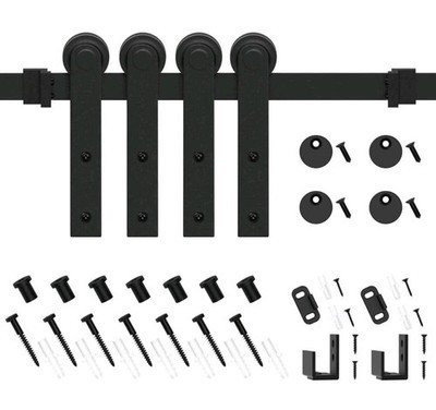 The WINSOON 6FT Super Mini Barn Door Track Kit includes a unique I shape hanger for double doors. Made of carbon steel and plastic, this black finish kit comes with 2x12.4'' rails, 4x11.8'' rails, 7x track supports, 4 rollers, and 4 door stoppers. Assembly is required, and the item weighs 6.16 pounds. The item is sold by WINSOON and is not discontinued.