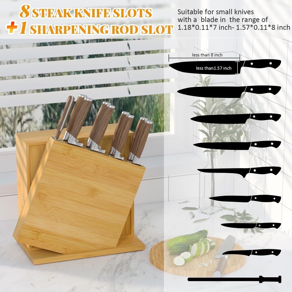 Knife Holder Organizer - Set with 9 slots to prevent blades from rubbing against each other and keep them sharp. Can holds up to 8 steak knives and 1 sharpening rod (not included). Slot dimensions: 4 slots - 1.57" x 0.11" x 8.18", 4 slots - 1.18" x 0.11" x 7", and 1 slot - 0.47" x 0.47".