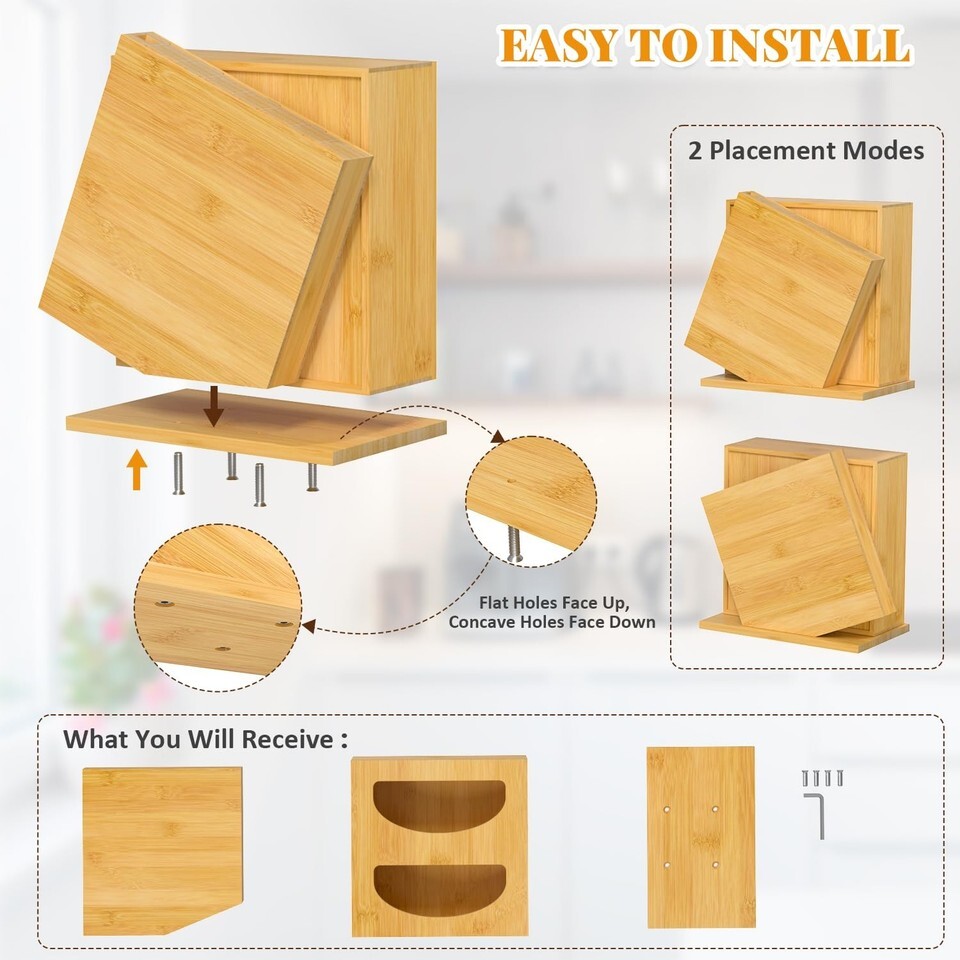 Flexible Installation - The knife block can be installed in the desired direction - left or right; and then fixed with screws. (Installation Tips: Please pay attention to the direction of the bottom plate. The flat hole side faces up to contact the organizer, and the concave hole side faces down to embed the screws.)