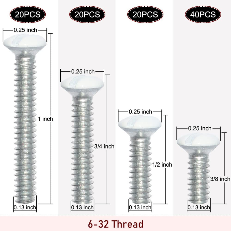 [Application]: The white switch plate screws are suitable for office, home and commercial etc occasions. This 6-32 thread wall plate screws can be used to wall plate, wall outlet, electrical panel, electrical outlet, switch plate etc.