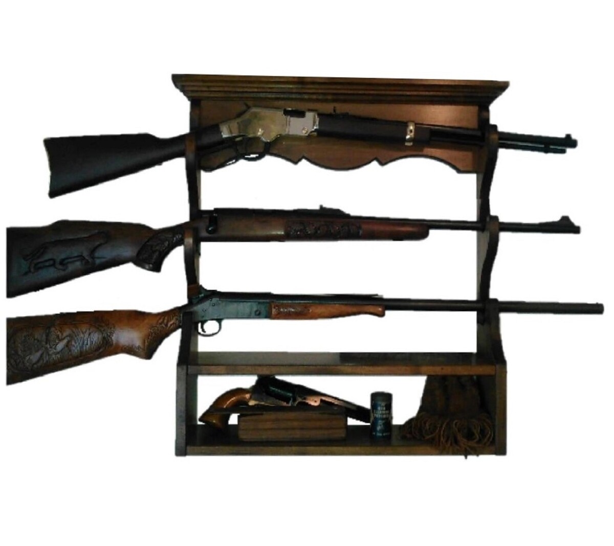 - Walnut Wooden Gun Rack 3 Place Rifle Shotgun Wall Display with Ammo Storage