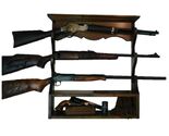 Solid walnut wooden wall gun rack for your antique or modern rifle, shotgun, or any type of long gun. Sturdy, durable, handsome, a perfect compliment to your guns or other equipment. Made in USA, gloss finish, mounting hardware included, Measures 24 3/8" inches wide by 25 1/4" inches tall, by 5 3/8" inches deep, 1 1/2" inches diameter openings for most single barrel rifles, assembled, then disassembled for shipping . (c)2003/2025 All rights reserved