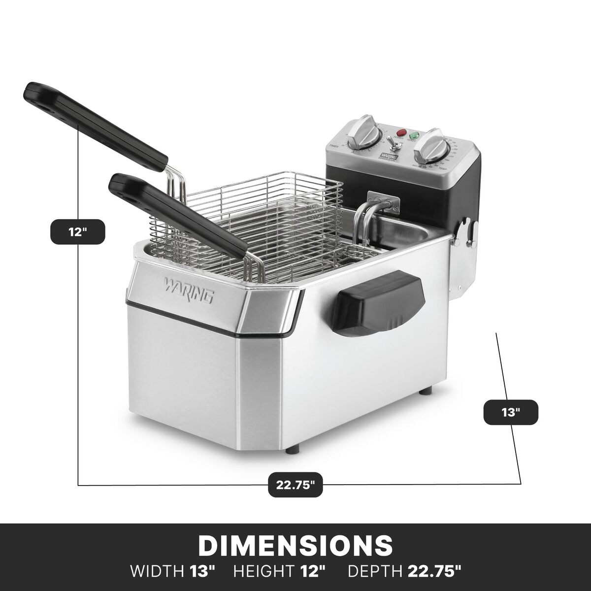 Cook up to lb. of fries per hour with the Waring WDF Heavy-Duty lb. Deep Fryer. This large capacity, V unit heats up and cools down quickly. Its hinged heating element and removable stainless steel tank make it easy to clean. Includes a -minute timer and variable temperature controls up to degrees Fahrenheit. Great for catering.