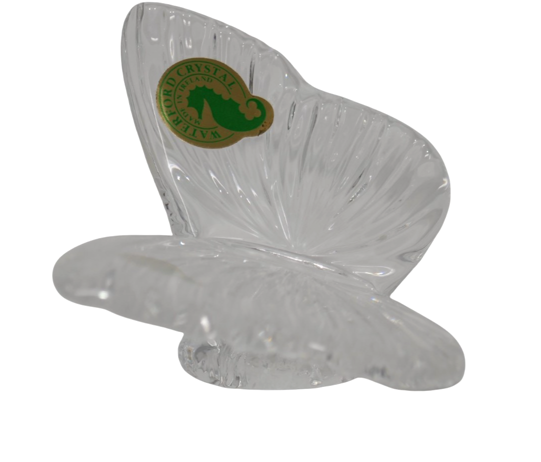 The Waterford Crystal Clear Cut Glass Butterfly Paperweight Figurine is a vintage piece crafted in Ireland by Waterford. This measures approx. 3.25" wide with the Waterford sticker intact. Signed by Waterford, this original piece exudes elegance and charm with its clear crystal material and intricate details, perfect for collectors or those looking to add a touch of Irish craftsmanship to their home.