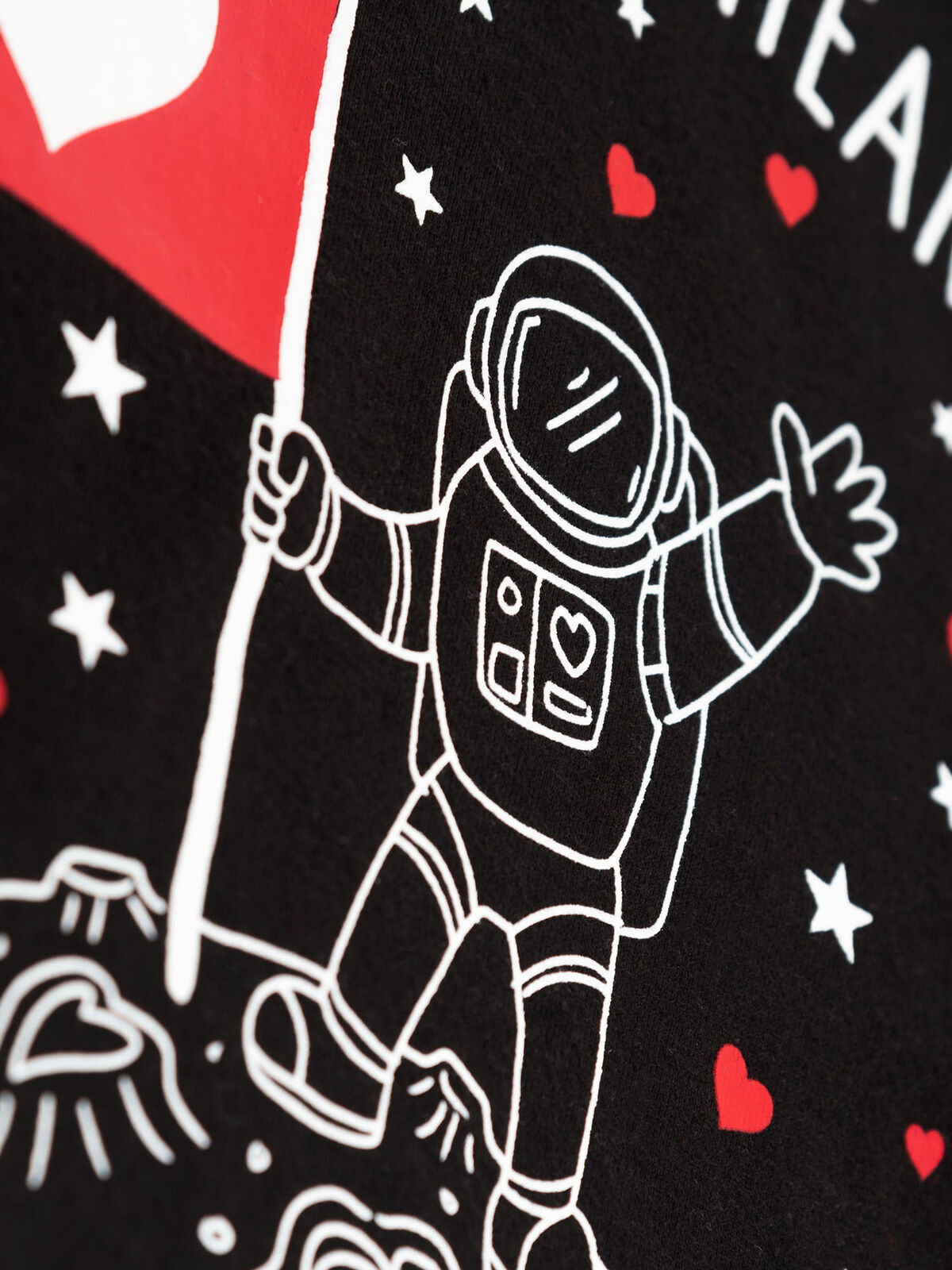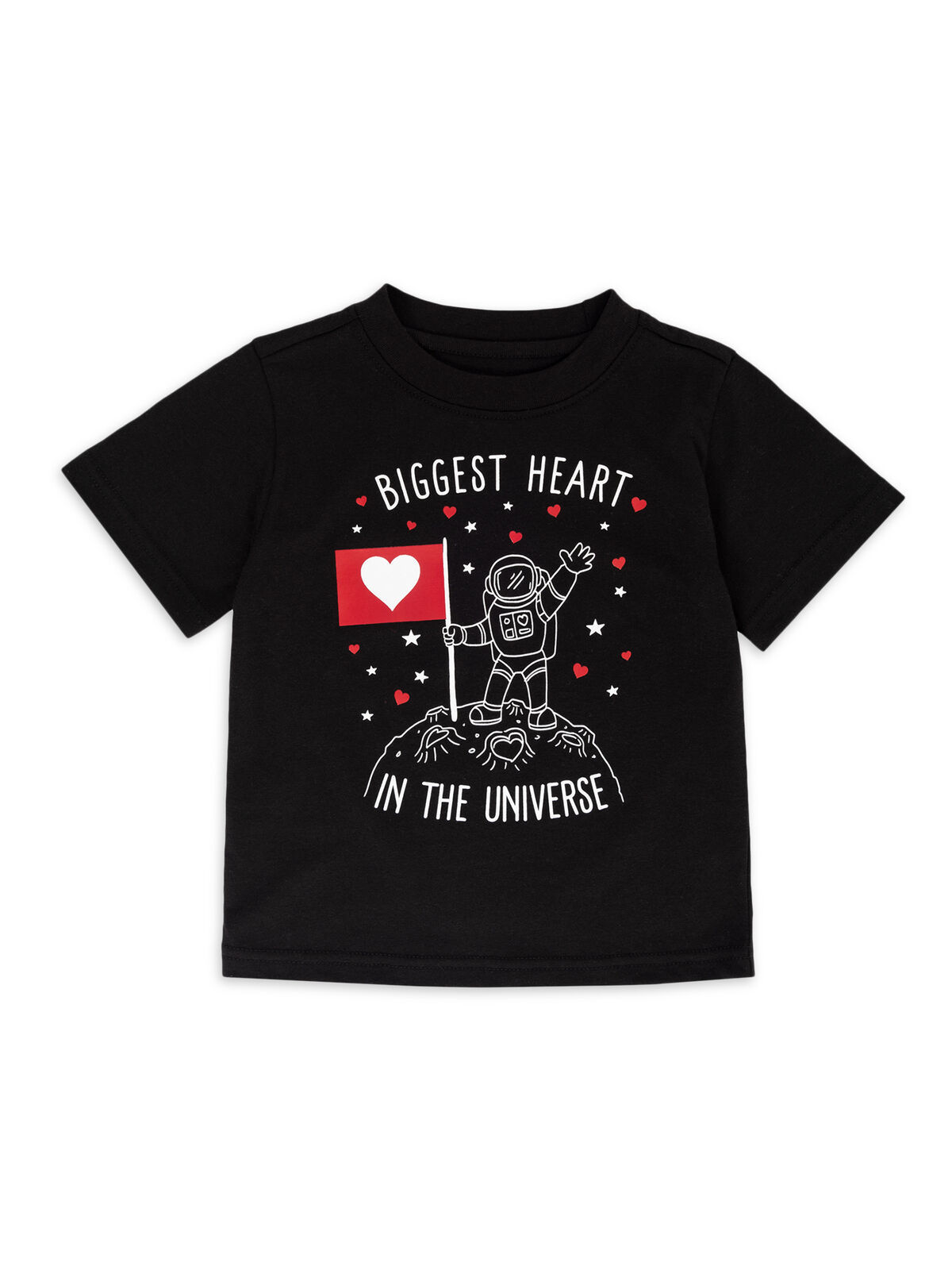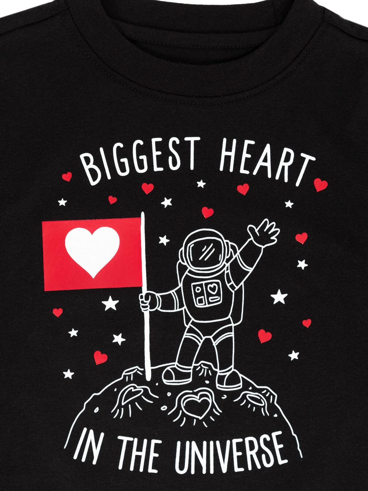 Your little one will look adorable in this black short sleeved "Biggest heart in the universe" astronaut themed Valentine's Day tee shirt!