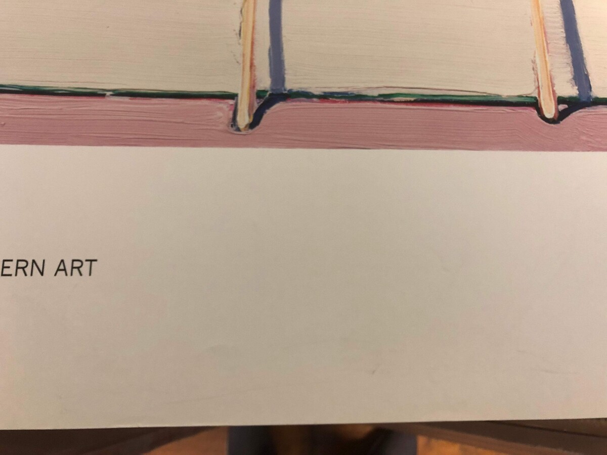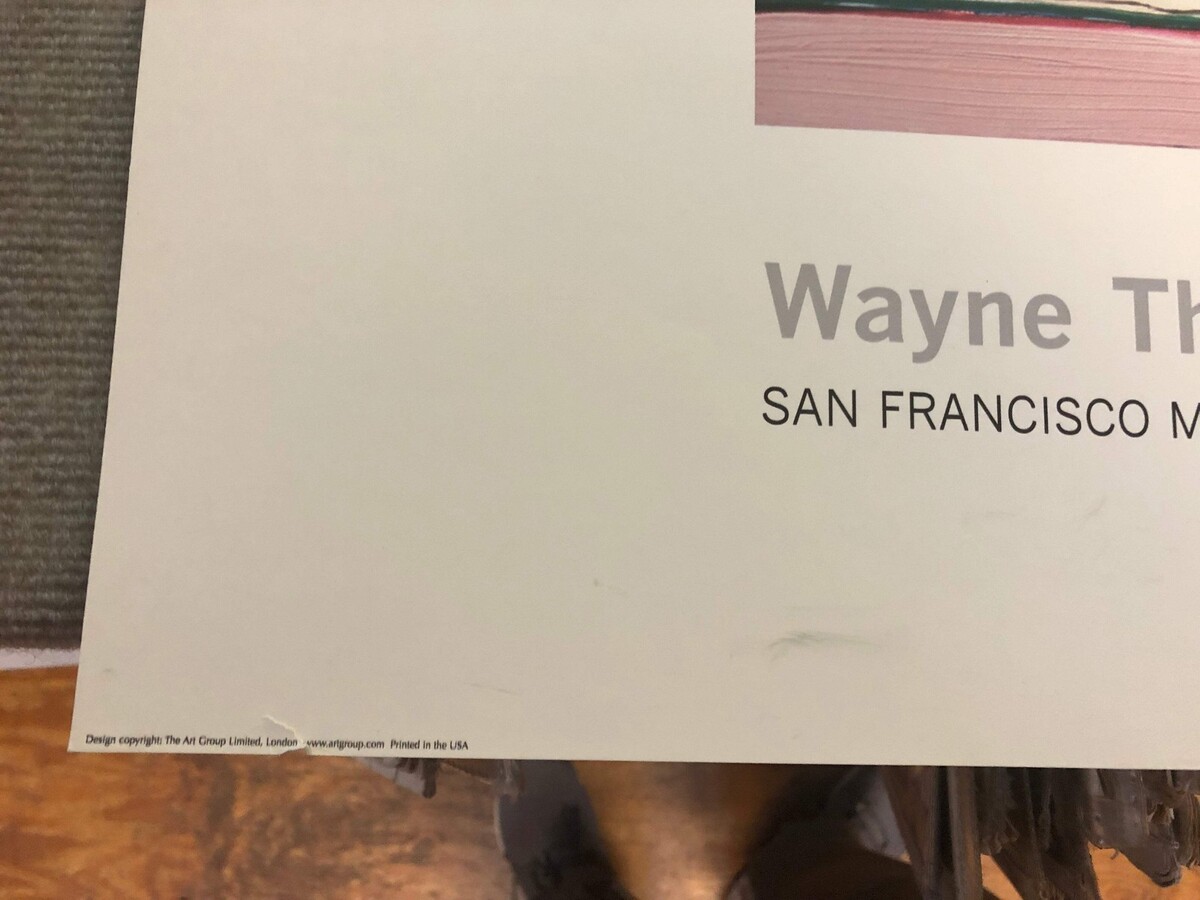 Sku: YY2497-BArtist: Wayne ThiebaudTitle: Three Wind Toys (Lg)Year: 2014Signed: YesMedium: Offset LithographPaper Size: 32 x 40 inches ( 81 x 102 cm )Image Size: 21 x 28 inches ( 53 x 71 cm )Edition Size: UnknownFramed: No: Inquire with our experts for framing suggestions.Condition: A-: Near Mint, very light signs of handlingSupplemental Condition Information: Small tear in the lower edge. Scuffing throughout border with light denting. Additional Details: This exquisite poster, featuring Wayne Thiebaud's "Three Wind Toys," commemorates his exhibition at the San Francisco Museum of Modern Art and is hand-signed in black marker by the artist. The vibrant and whimsical artwork exemplifies Thiebaud's unique ability to transform everyday objects into captivating art. This poster, donated to the Foundation for the Arts?a New York City-based organization founded by Jasper Johns that supports artists and cultural events?carries significant cultural and philanthropic value. The hand-signed element and its association with both the prestigious museum and the charitable foundation make this poster a rare and highly collectible piece, ideal for any art enthusiast or collector.