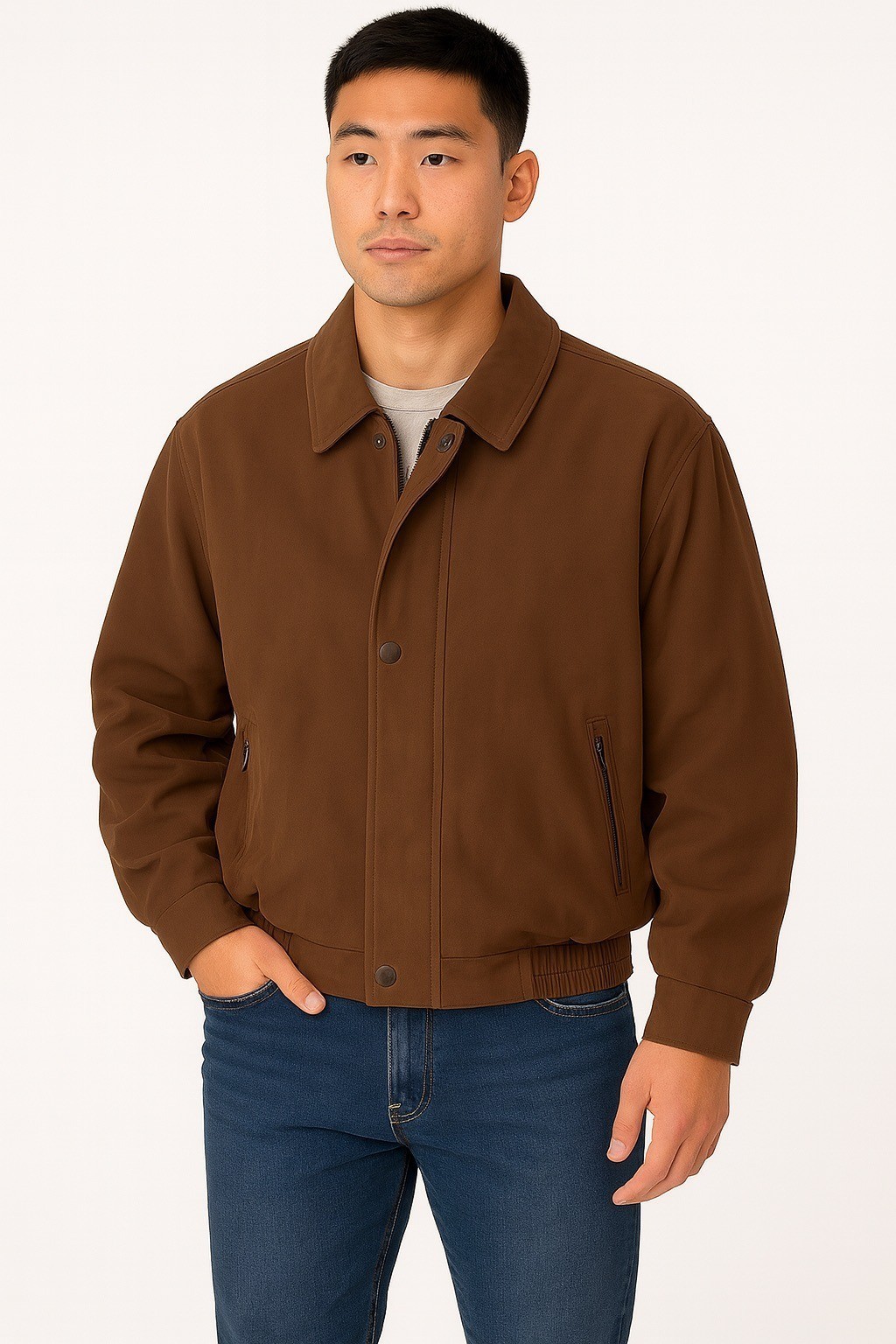 Classic brown microsuede jacket by Weather Report featuring a smooth zip-front design with snap placket and full satin lining. Lightweight yet substantial, this versatile jacket offers a soft suede-like feel in an easy-care polyester fabric?ideal for cool weather or casual everyday wear.