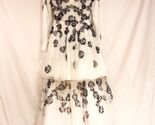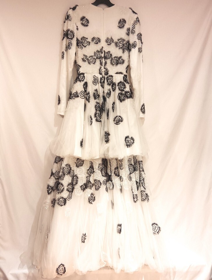 The dress offers a flattering boat neck and long sleeves, perfect for a bride seeking a balance of tradition and modern style. Its tiered layers and zipper back closure ensure a seamless and comfortable fit, making it an ideal choice for your most memorable day. The white color epitomizes purity and makes for a stunning contrast against the black floral design, leaving a lasting impression on everyone present.