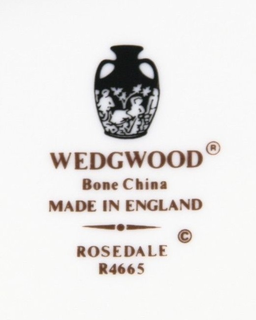 La parte inferiore e timbrata "Wedgwood / Bone China / Made in Inghilterra // Rosedale / R4665"